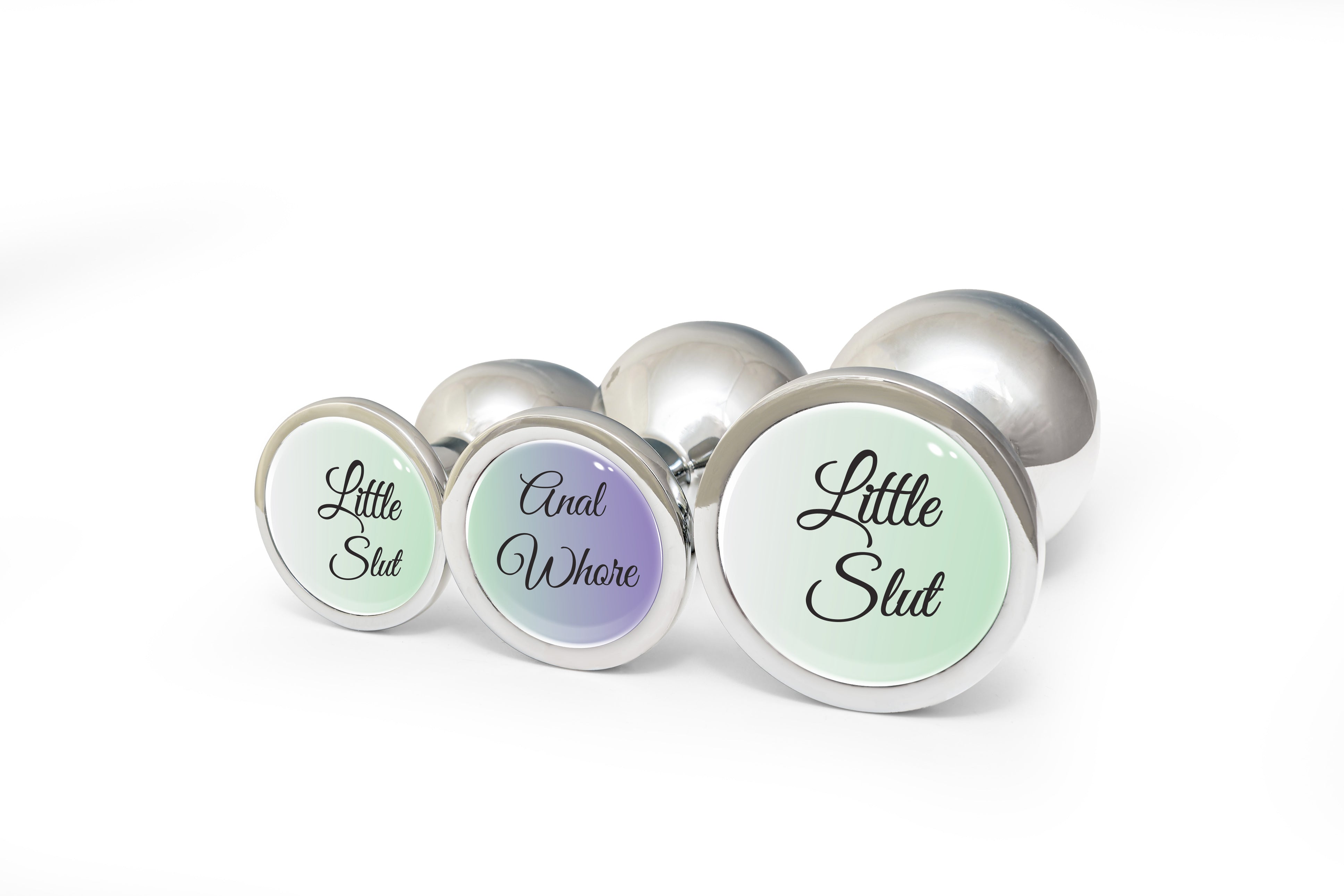 Анальная пробка металлическая серебристая с надписью Little Slut OKOVA размер M