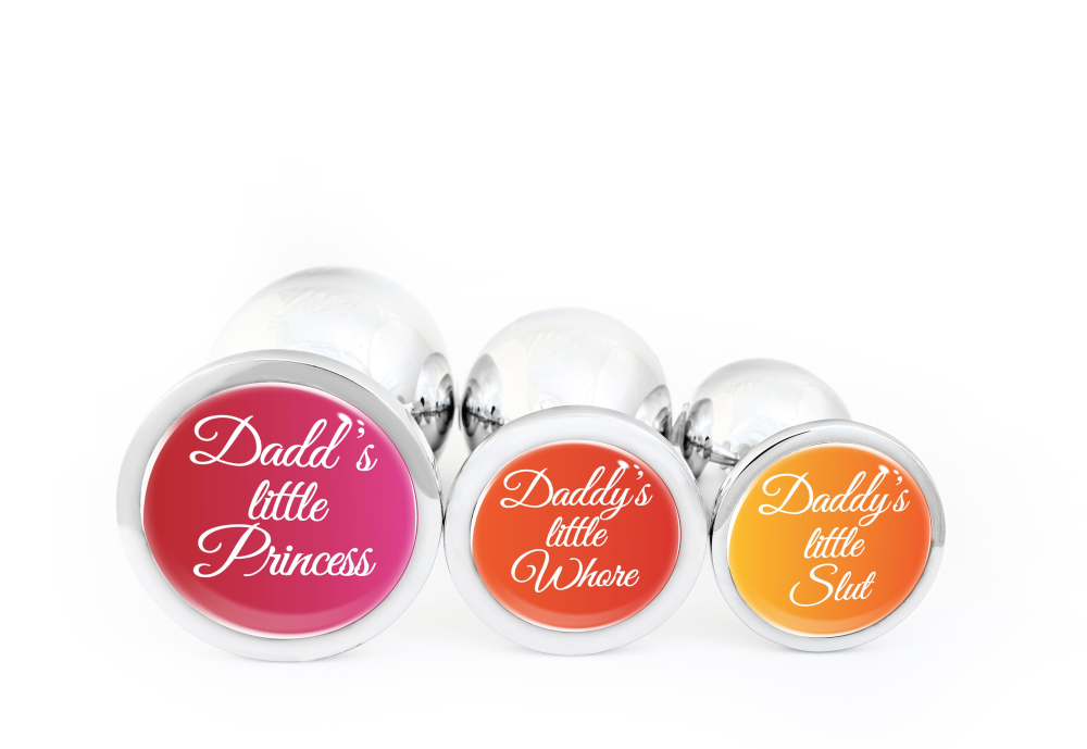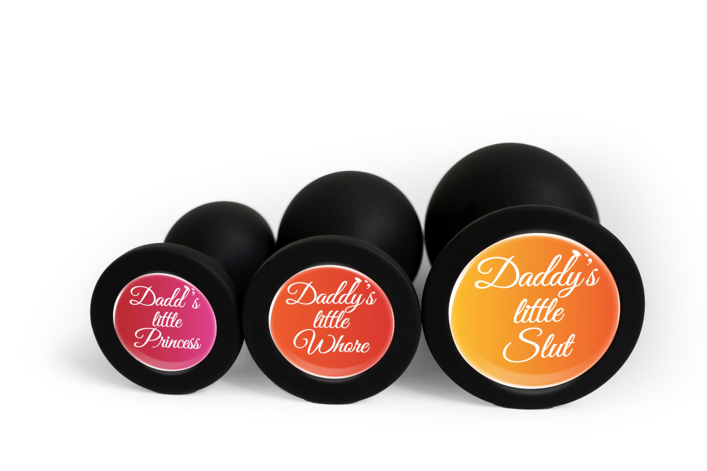 Анальная пробка силиконовая черная с надписью Daddy's little Whore OKOVA размер S