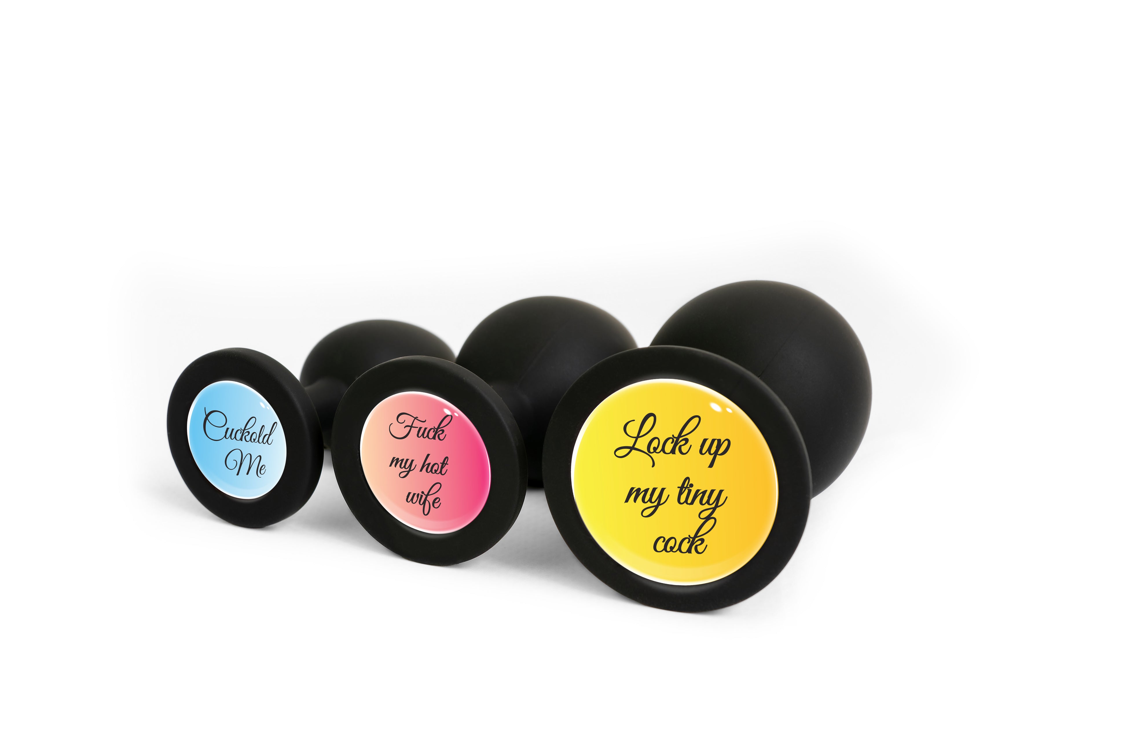 Анальная пробка силиконовая черная с надписью Lock up my tiny Cock OKOVA размер S