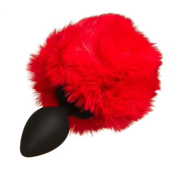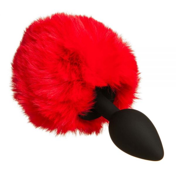 Анальная пробка силиконовая черная с красным помпоном Зайка размер S