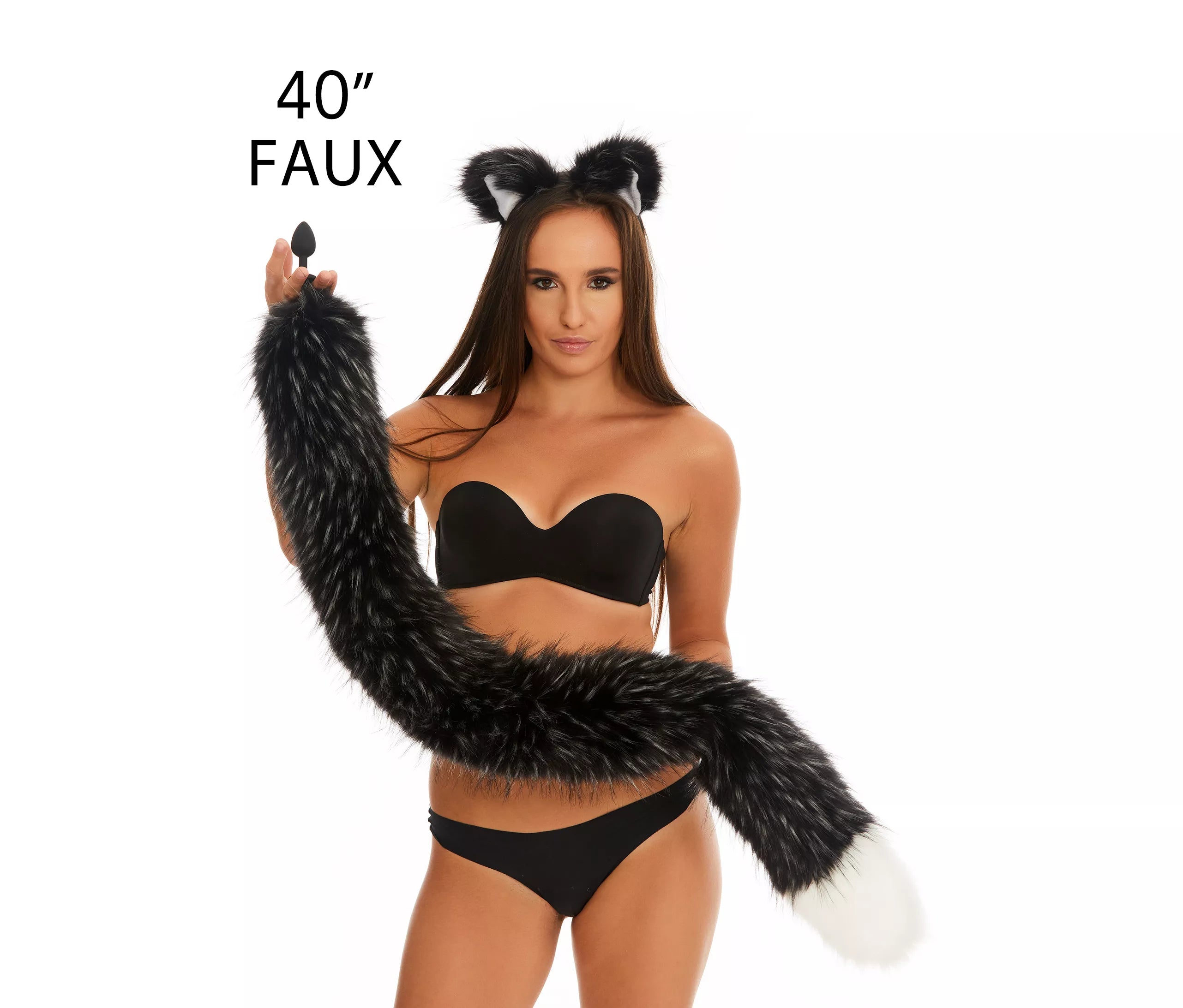 Анальный меховой хвост без пробки Чернобурый с белым кончиком OKOVA 1000 мм