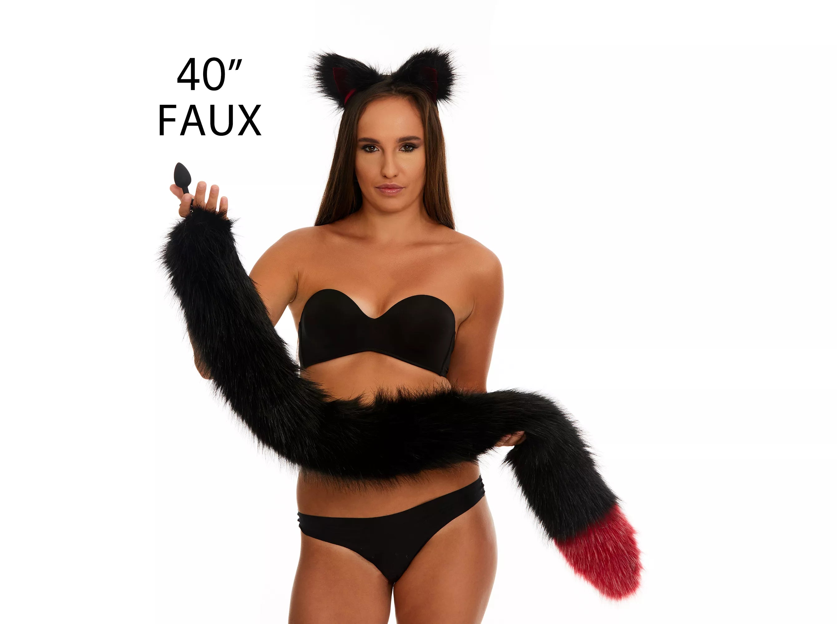 Анальный меховой хвост без пробки Черный с темно красным кончиком OKOVA 1000 мм