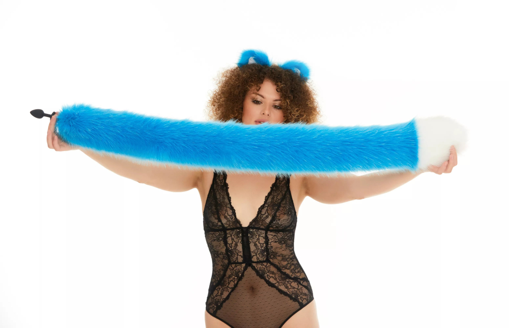Анальный меховой хвост без пробки Ярко голубой с белым кончиком OKOVA 1000 мм