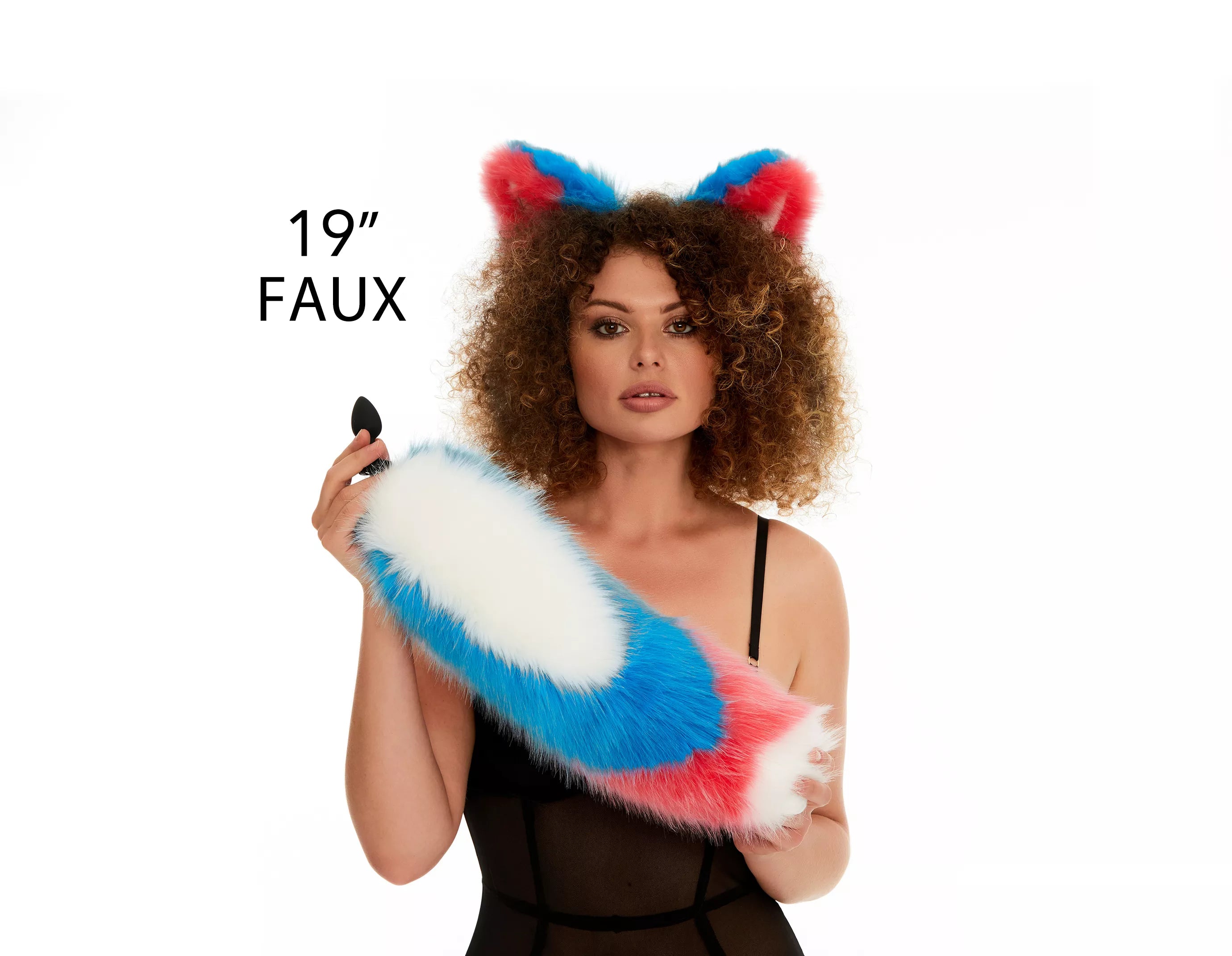 Анальный меховой хвост без пробки Трехцветный Белый Ярко голубой ярко розовый с белым кончиком OKOVA 500 мм