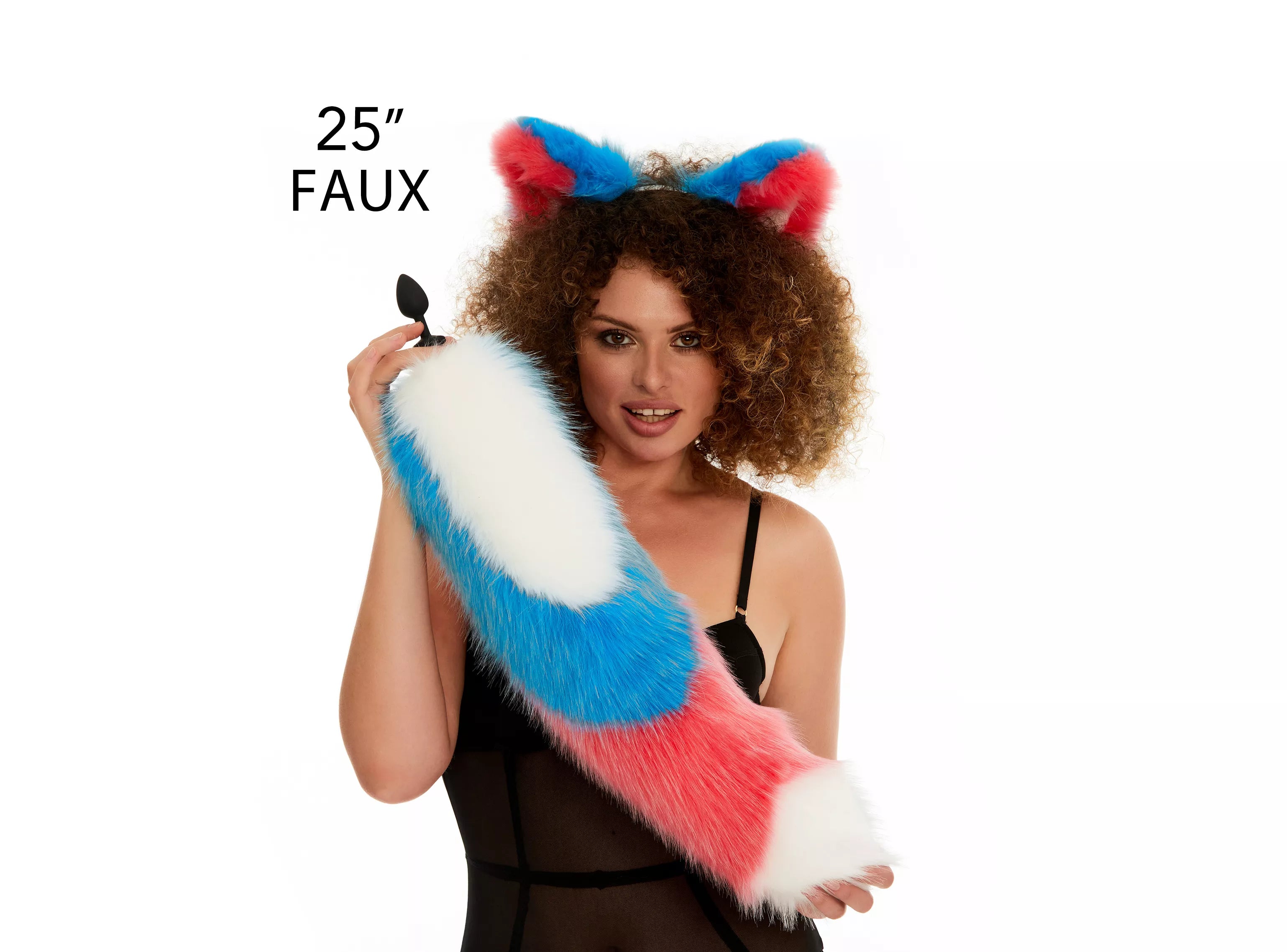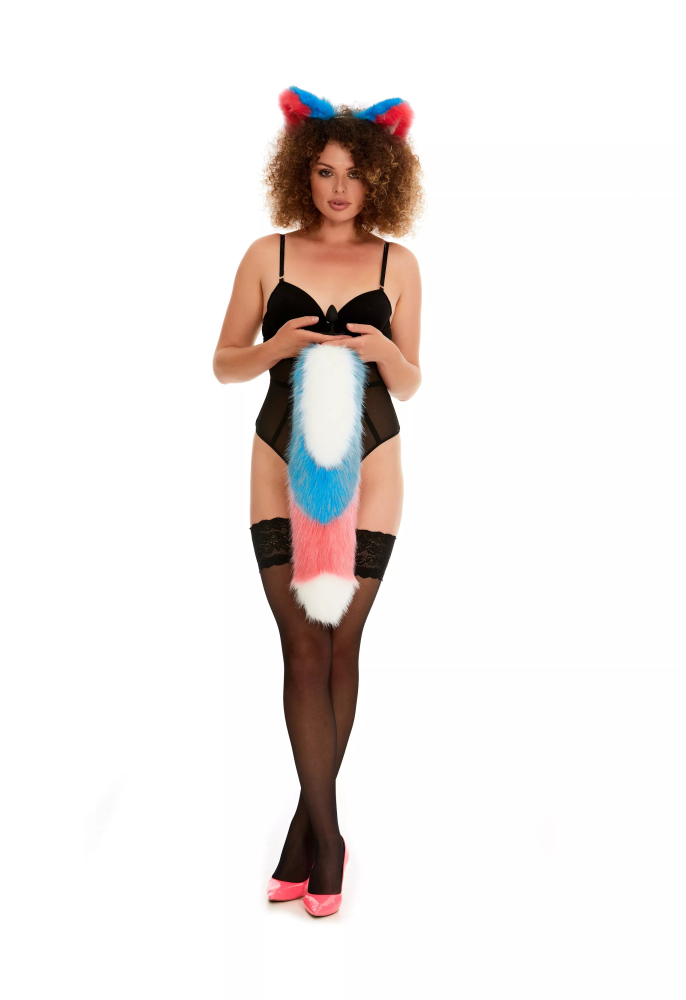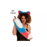 Характеристики Анальный меховой хвост без пробки Трехцветный Белый Ярко голубой ярко розовый с белым кончиком OKOVA 600 мм
