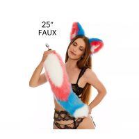 Анальный меховой хвост без пробки Трехцветный Белый ярко розовый ярко голубо с белым кончиком OKOVA 600 мм