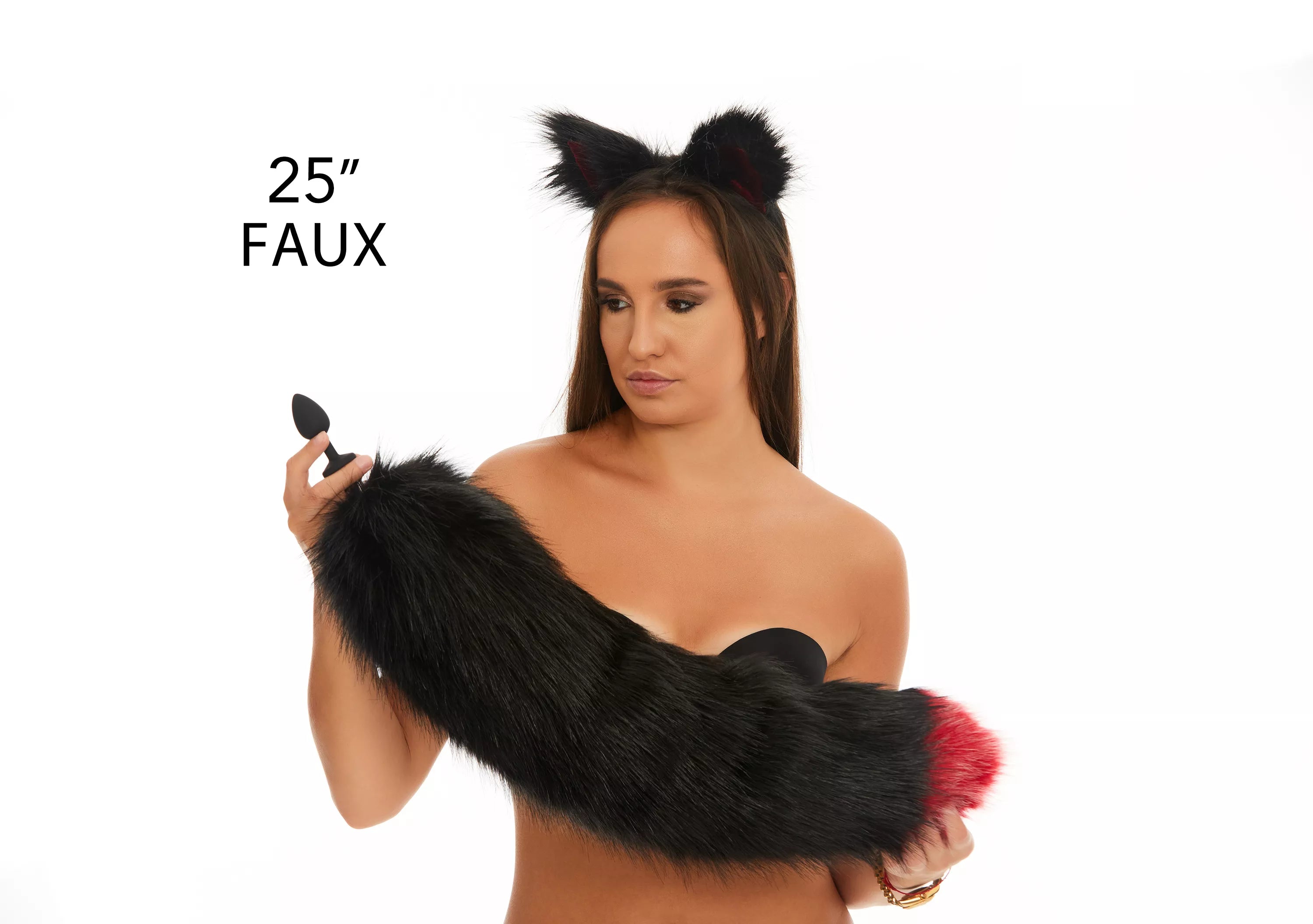 Анальный меховой пушистый хвост без пробки Черный с темно красным кончиком OKOVA 600 мм