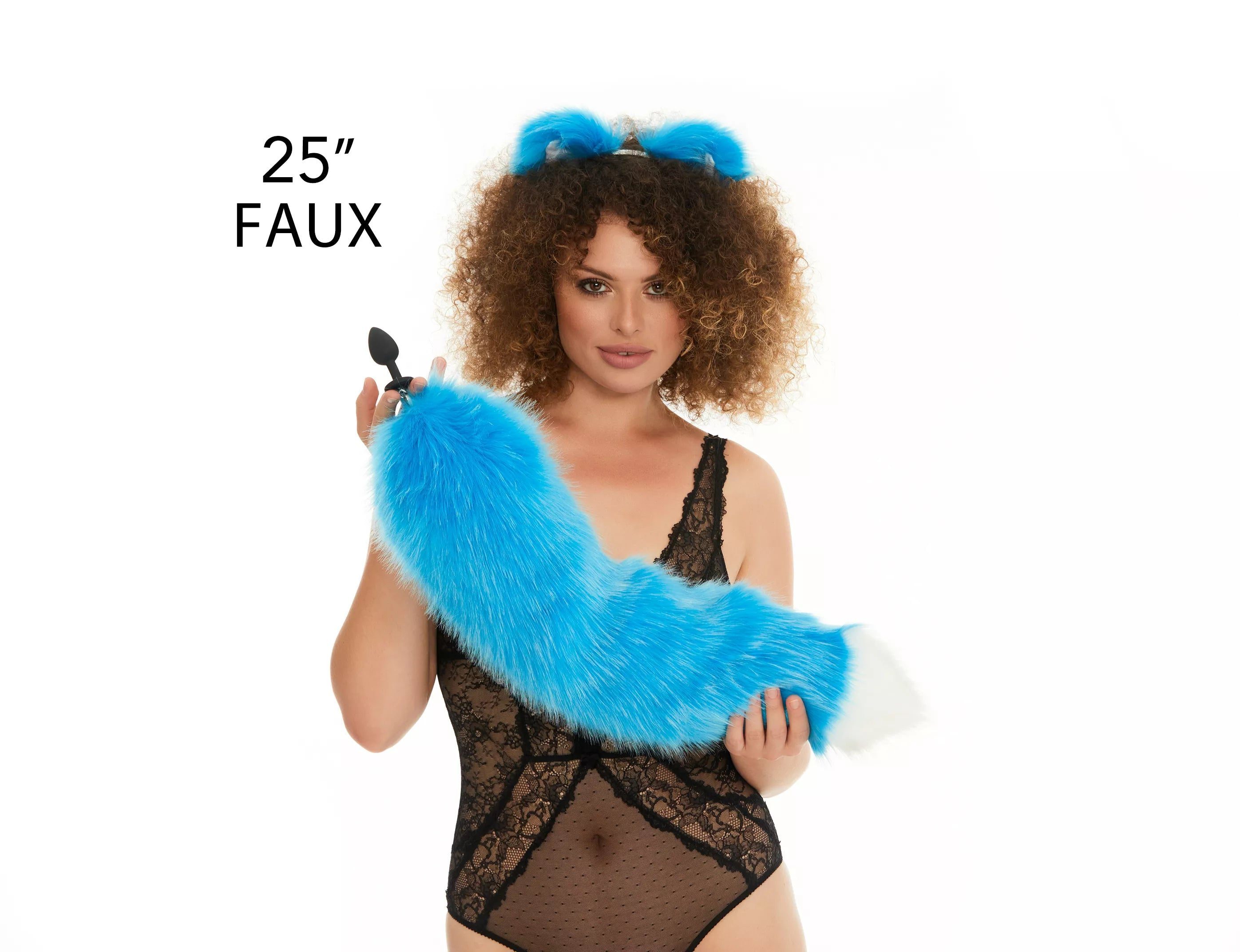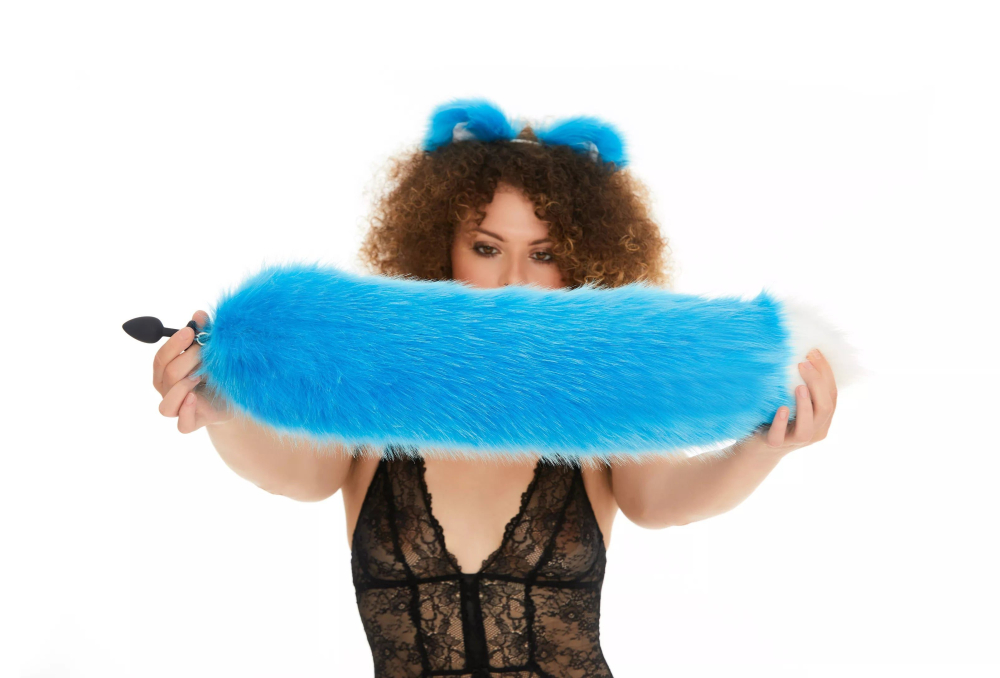 Анальный меховой пушистый хвост без пробки Ярко голубой с белым кончиком OKOVA 600 мм
