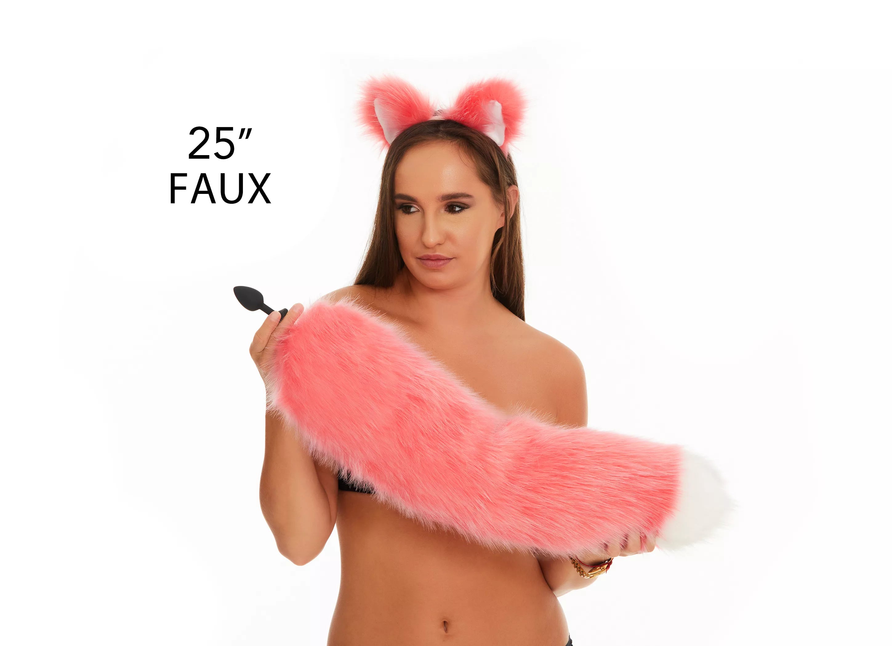 Анальный меховой пушистый хвост без пробки Ярко розовый с белым кончиком OKOVA 600 мм
