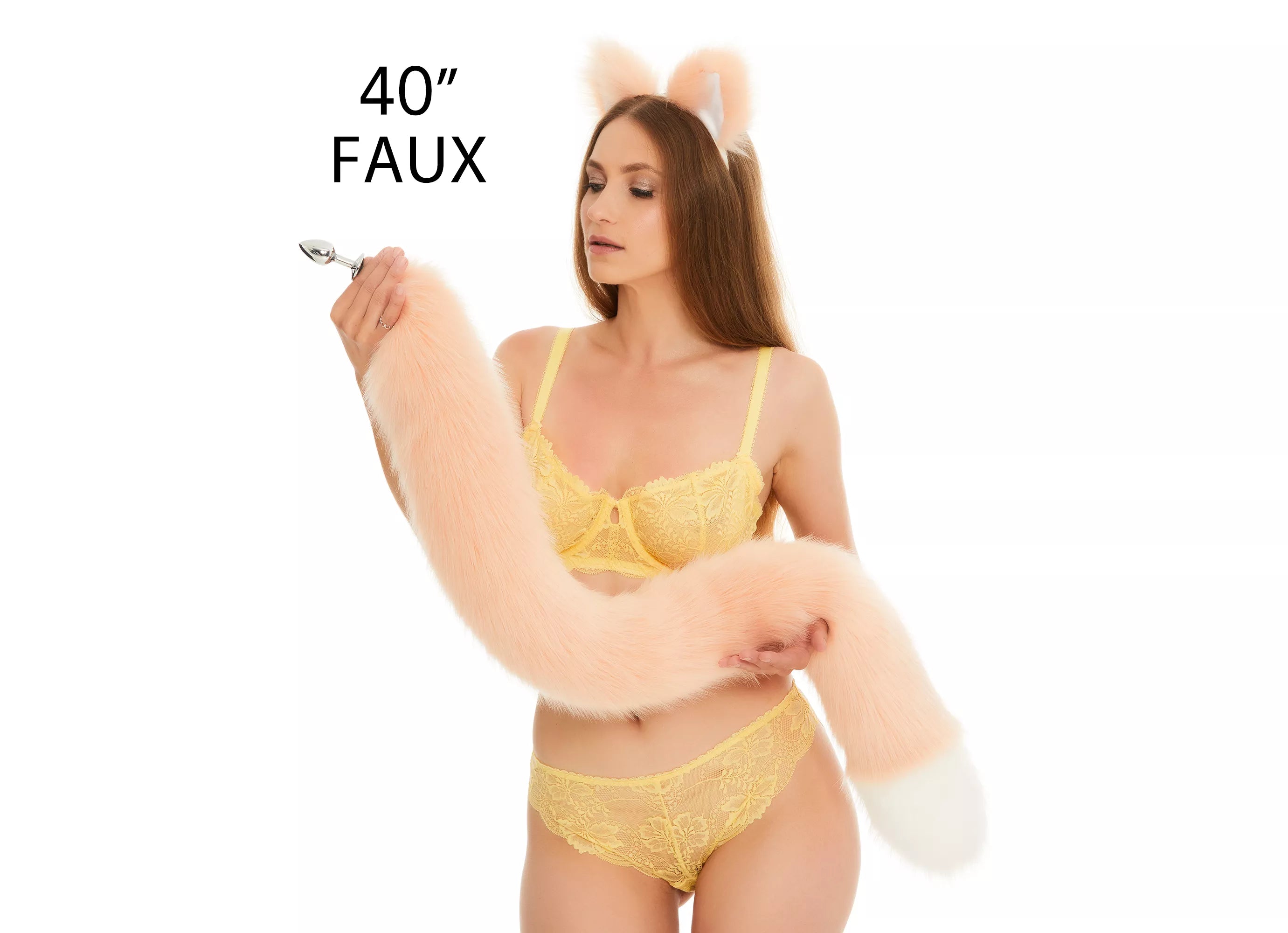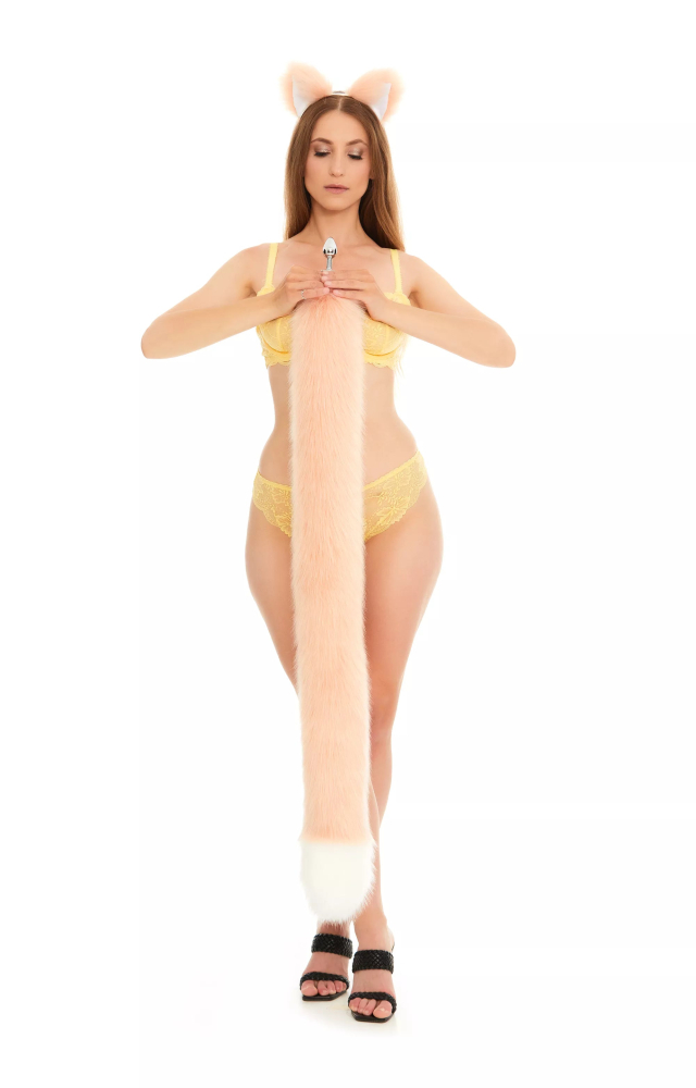 Анальный меховой пушистый хвост без пробки Персиковый с белым кончиком OKOVA 1000 мм