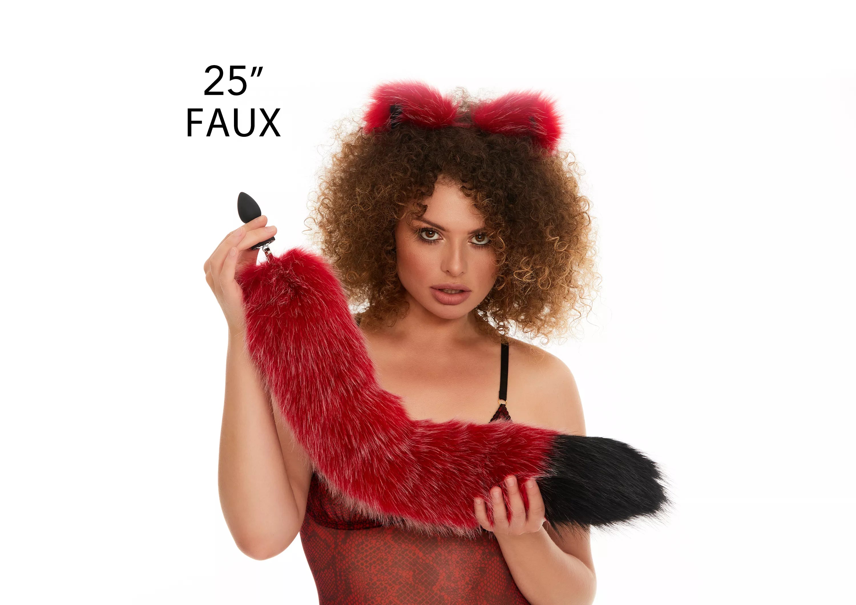 Анальный меховой пушистый хвост без пробки Темно красный с черным кончиком OKOVA 600 мм