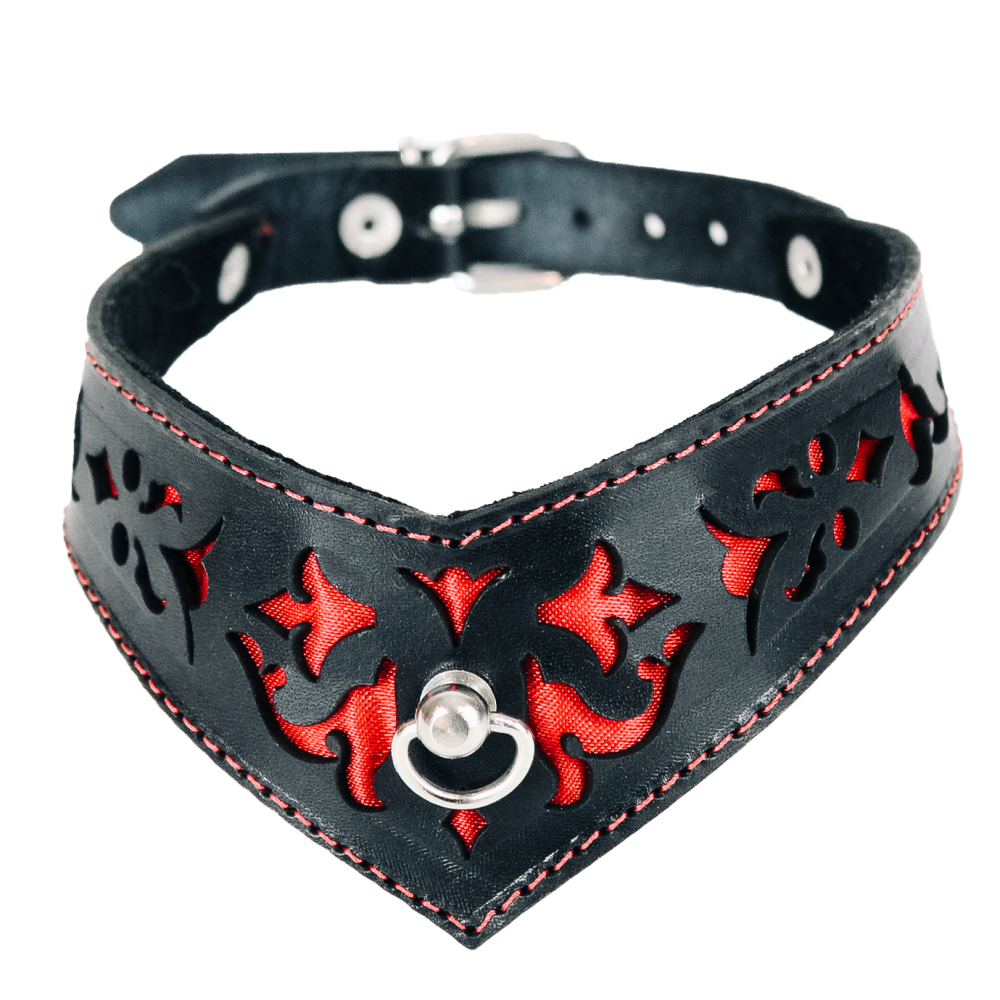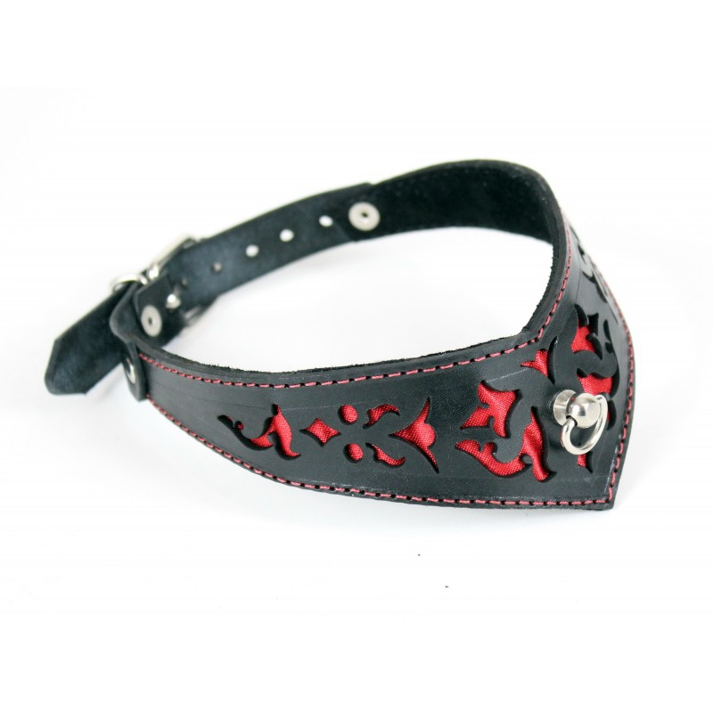 Ажурный ошейник с красными вставками БДСМ из натуральной кожи черного цвета Scappa ширина 45 мм