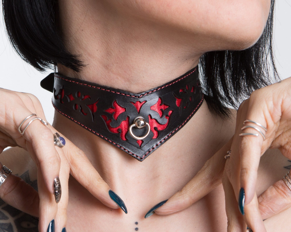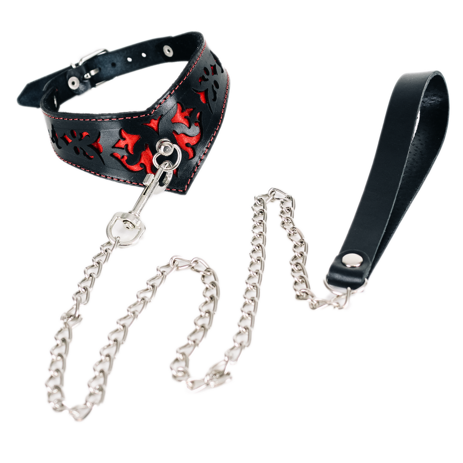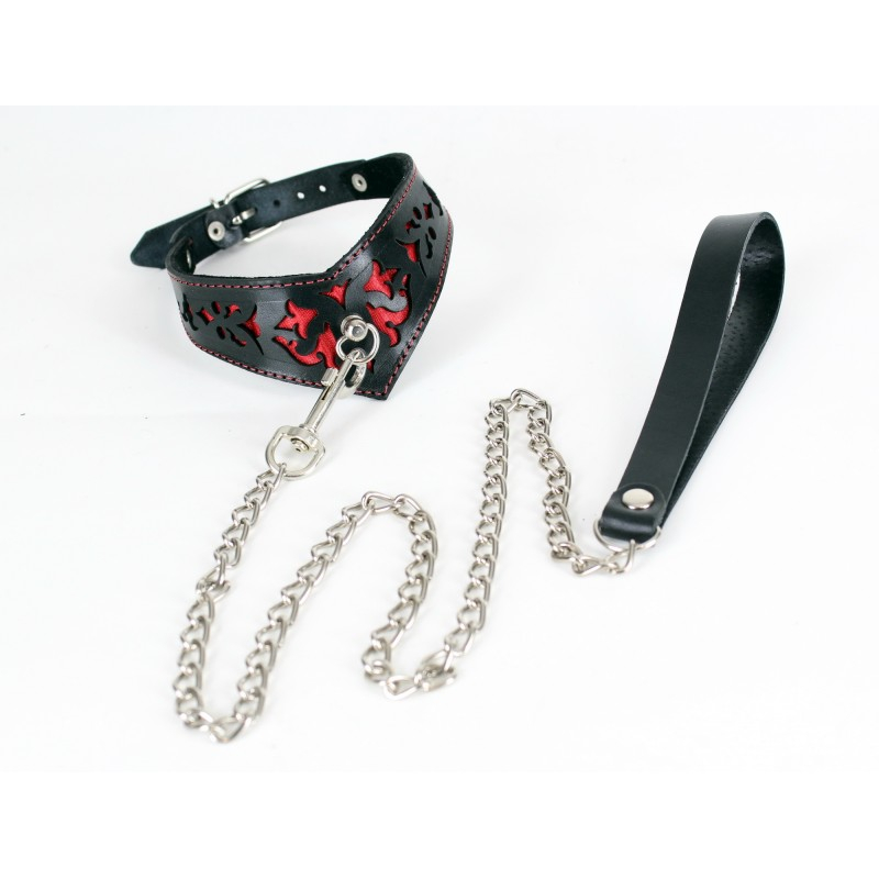 Ажурный ошейник с поводком БДСМ из натуральной кожи черно красного цвета Scappa