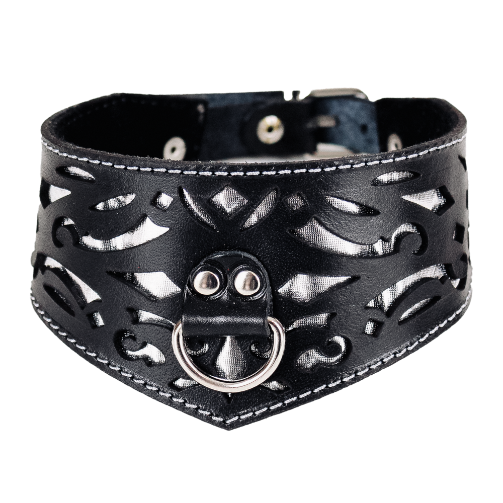 Характеристики Ажурный широкий ошейник с серебристыми вставками БДСМ из натуральной кожи черного цвета Scappa ширина 60 мм