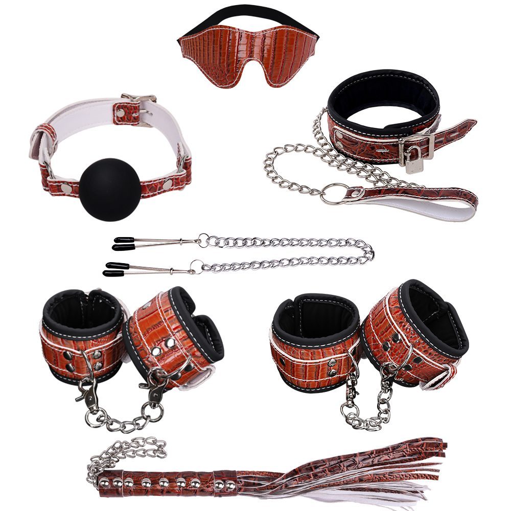 БДСМ набор (маска, ошейник, кляп, зажимы д/сосков, наручники, оковы, плеть) экокожа, цвет коричневый Notabu NTU-80448