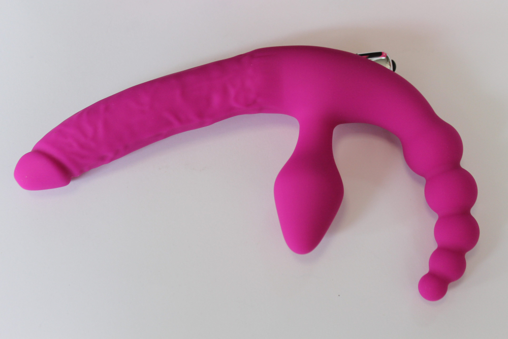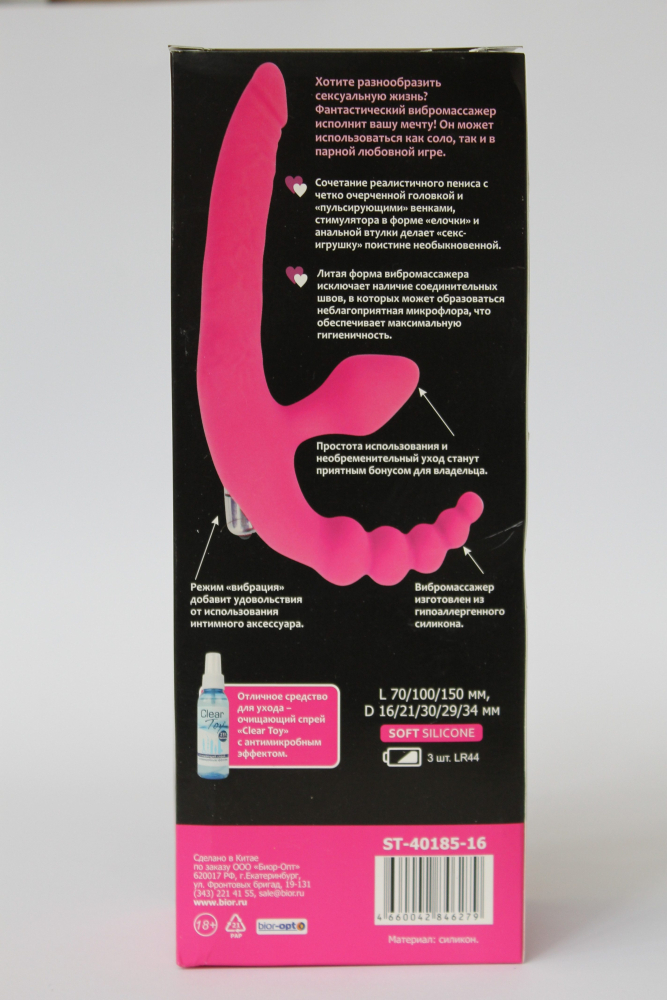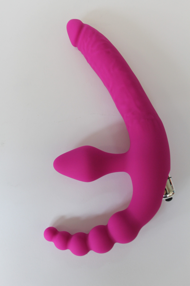 Характеристики Безремневой страпон с вагинальной и анальной стимуляцией L 70x100x150 мм D 16x21x30x29x34 мм, цвет ярко-розовый