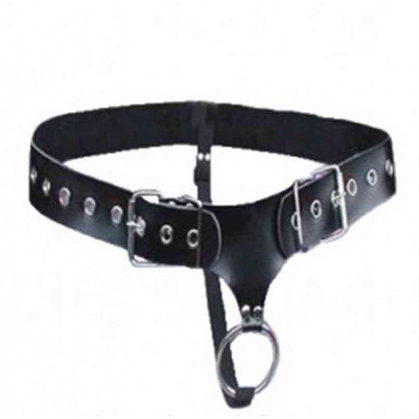 Черный пояс из искусственной кожи с металлическим кольцом-фиксатором для пениса. Регулируемые ремни.