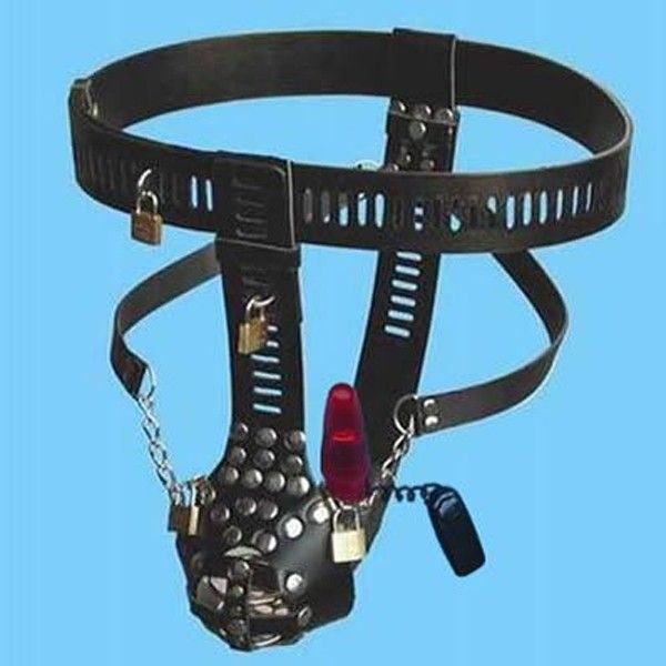 Черное мужское устройство целомудрия из высококачественного материала с анальным вибратором. Интересный дизайн. Украшен металлическими цепями.