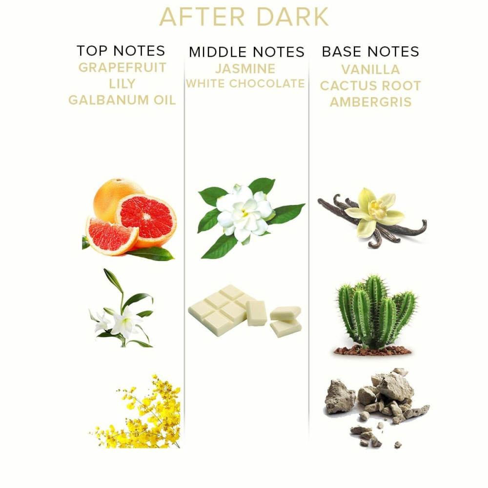 С начальными нотами теплого жасмина, лилии и сливочно-сладкого белого шоколада, After Dark раскрывает свою соблазнительную сущность.