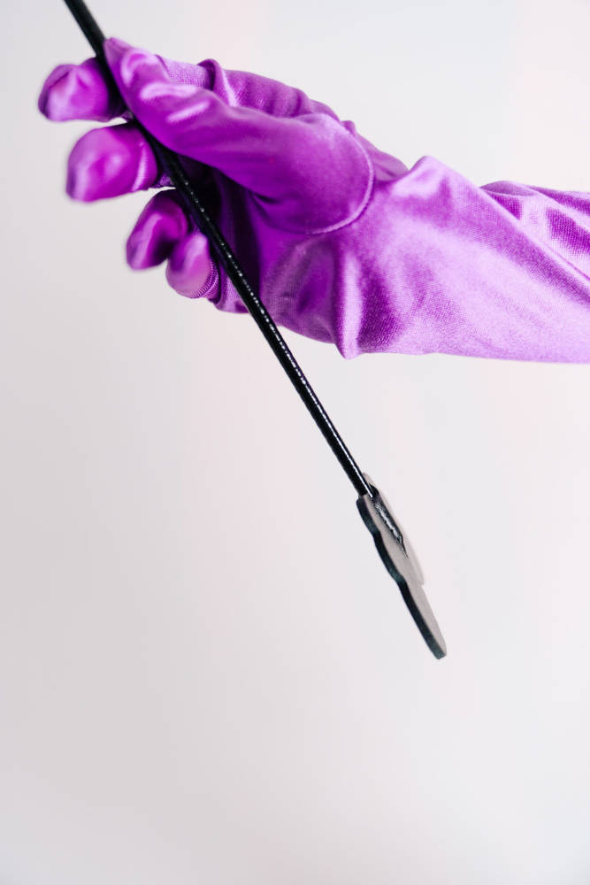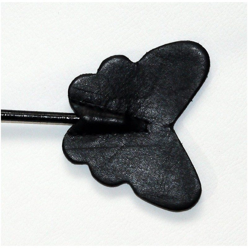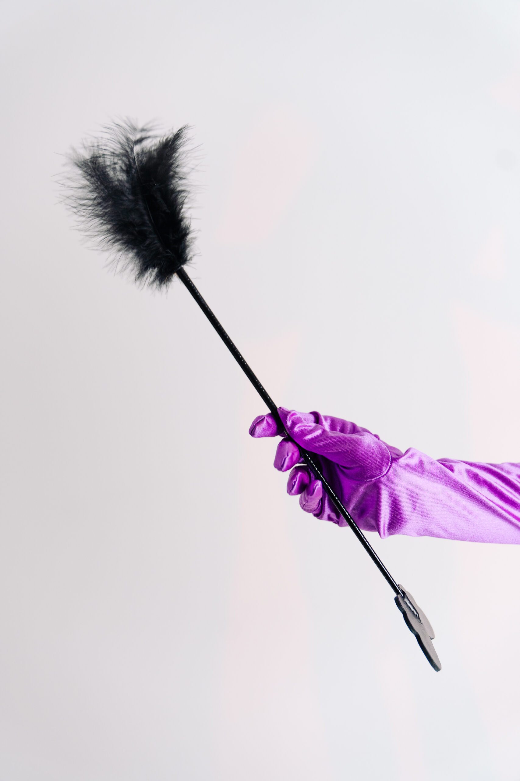 Стек двухстороннийФорма: ладонь, бабочкаЦвет: черный, красный, фиолетовыйРазмер: длина изделия -30смМатериал: натуральная кожа и перья