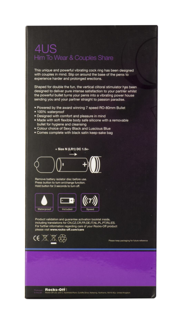 Выглядит игрушка очень стильно. Не устрашающе, «не грязно», и без намёка. Зато сколько удовольствия! 4US – это не просто кольцо для эрекции, это еще и клиторальный вибростимулятор, усиливающий ощущения партнерши. На внутренней поверхности колечка есть шарики, за счет которых игрушка не соскользнет в сторону, тем самым меняя диапазон вибровоздействия: встроенный вертикально вибратор не упустит эту «бусинку» из виду.