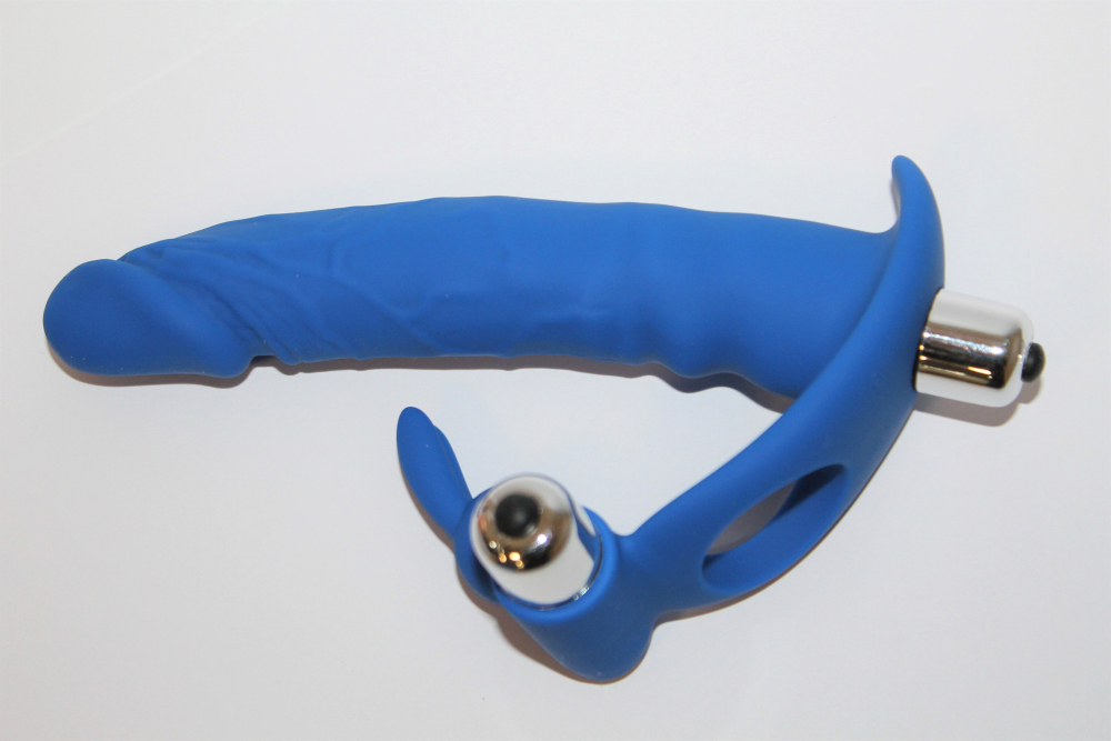 Эрекционное кольцо с клиторальным стимулятором и фаллосом для двойного проникновения Sweet Toys L 150 мм D 26 мм синий
