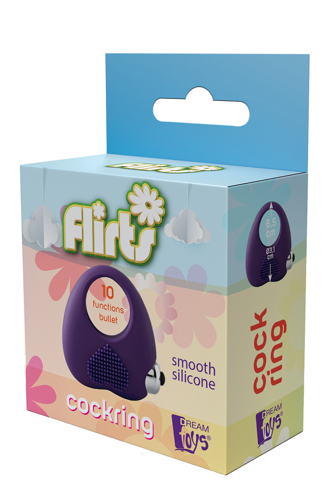 Flirts — это коллекция Dream Toys ярких цветов и упаковки, напоминающая о весне, голубом небе, солнечных днях и цветах. Вибрирующее кольцо для члена Flirts фиолетового цвета в форме сердца изготовлено из гладкого силикона. Кольцо растяжимое и гибкое. Верхняя часть кольца полового члена, в котором находится 10-функциональная вибрирующая пуля, имеет стимулирующие выступы с обеих сторон в форме сердца.