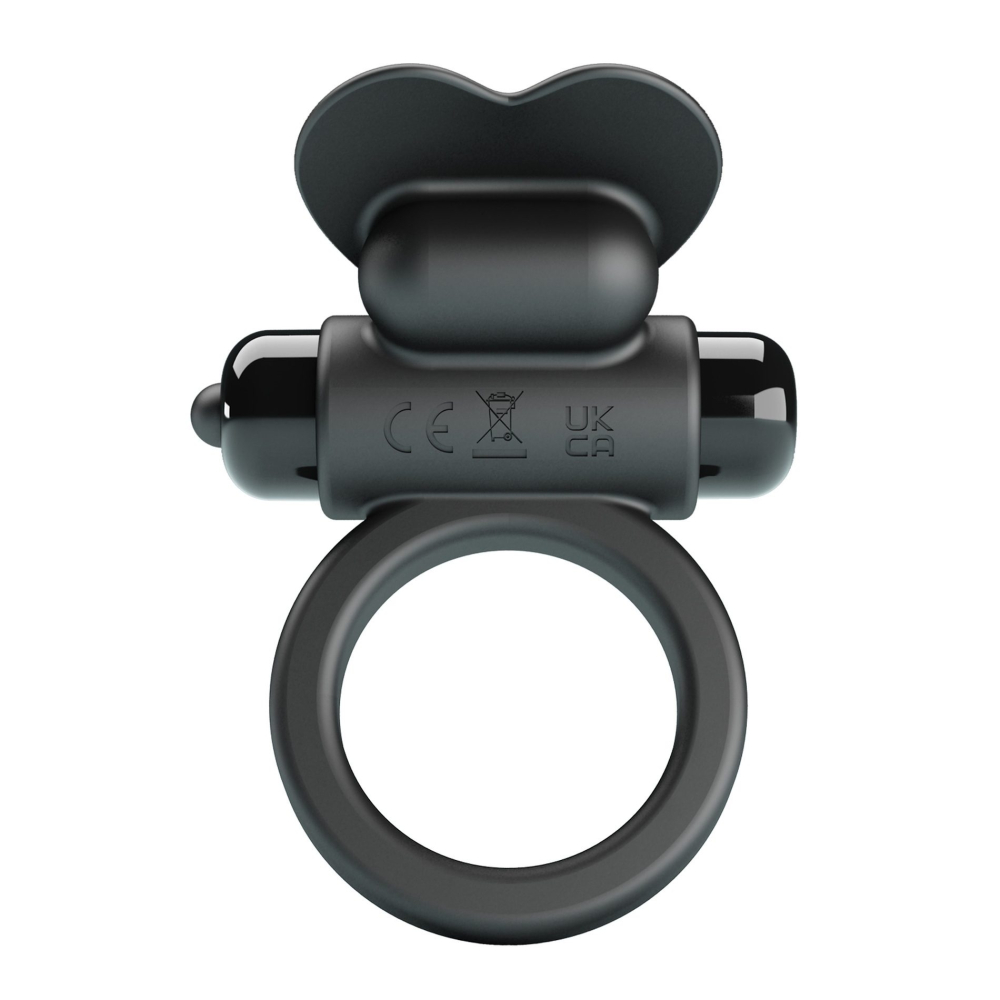 Эрекционное кольцо из упругого силикона с ребристой поверхностью и небольшими выступами, для дополнительной стимуляции клитора, с массажным вибростимулятором.