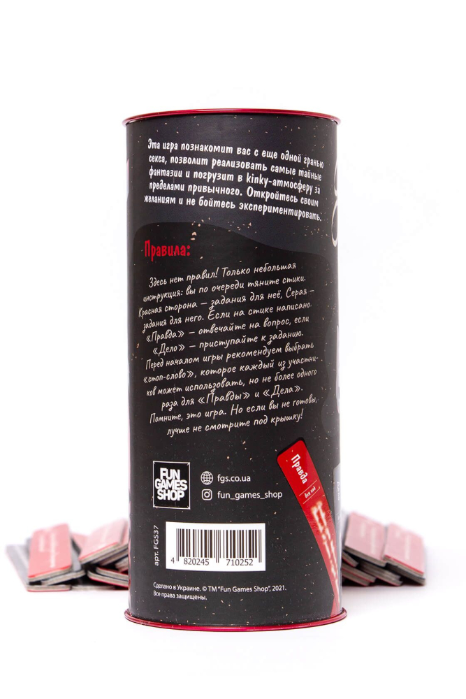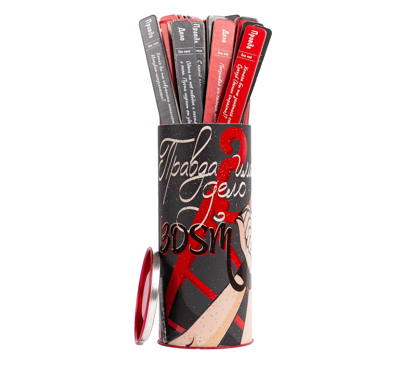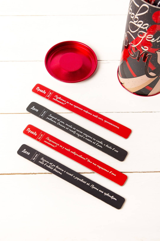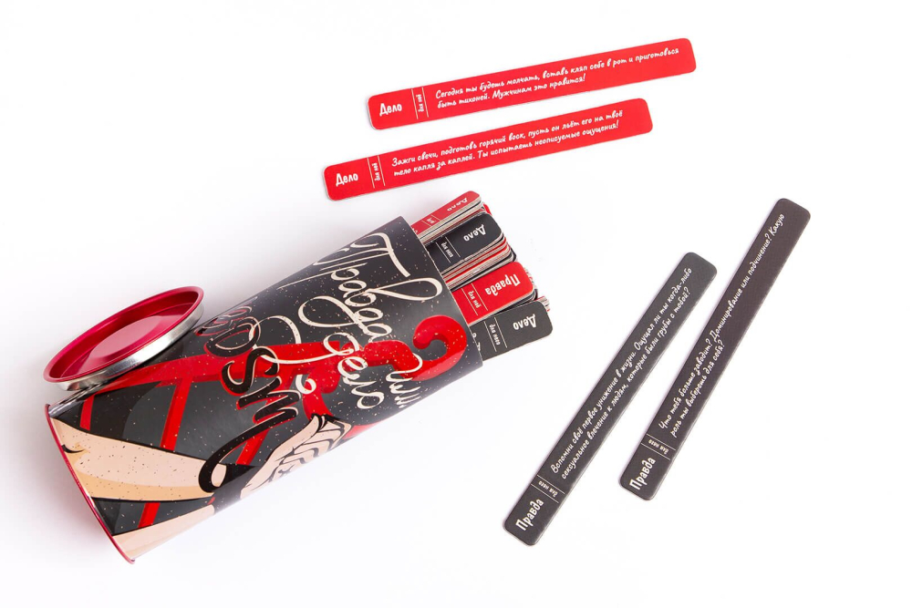 Коротко о правилах: Здесь нет правил! Только небольшая инструкция: вы по очереди тяните стики. Красная сторона — задания для неё, Серая — задания для него. Если на стике написано «Правда» — отвечайте на вопрос, если «Дело» — приступайте к заданию. Перед началом игры рекомендуем выбрать «стоп-слово», которое каждый из участников может использовать, но не более одного раза для «Правды» и «Дела». Помните, это игра. Но если вы не готовы, лучше не смотрите под крышку!