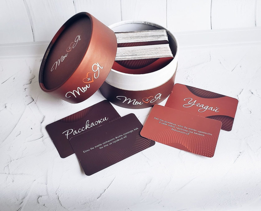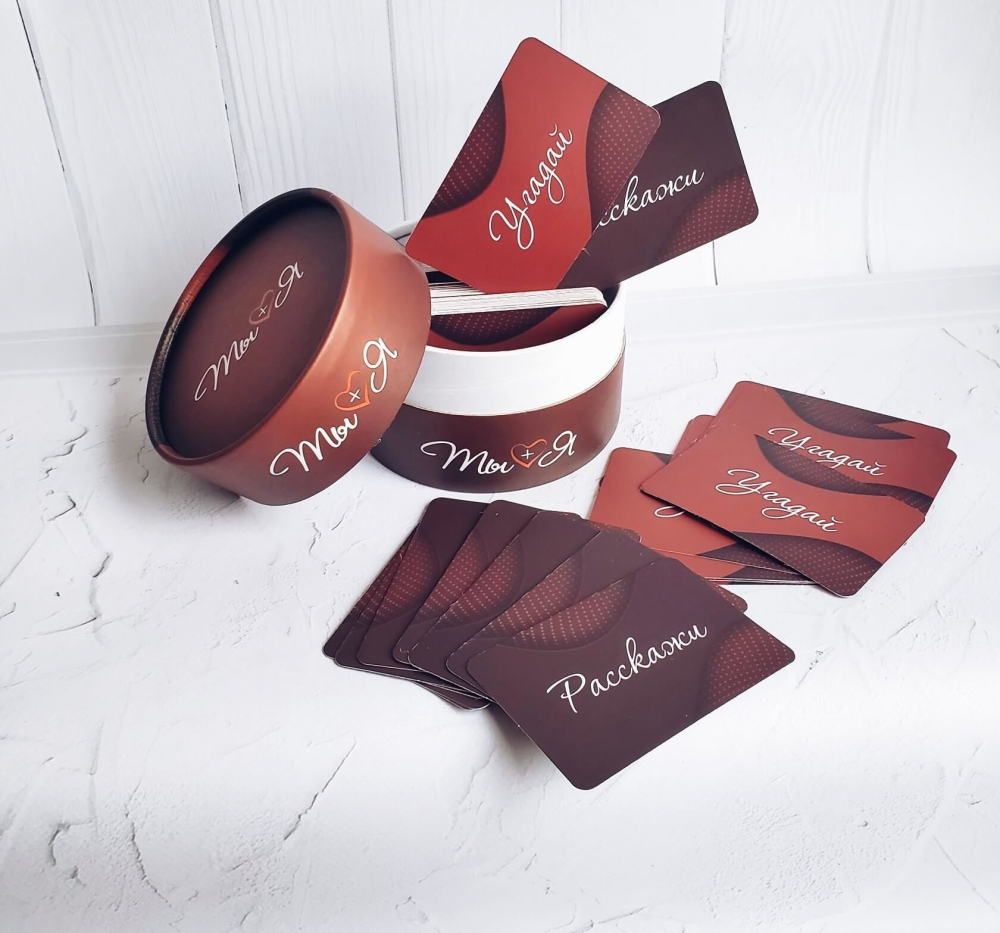 Коротко о правилах: Тяните карточки из разных колод и по очереди отвечайте на вопросы. Вытянули карточку «Расскажи» отвечаете на вопрос, который касается вас. Досталась карточка «Угадай» пытаетесь правильно ответить про вашего партнера.