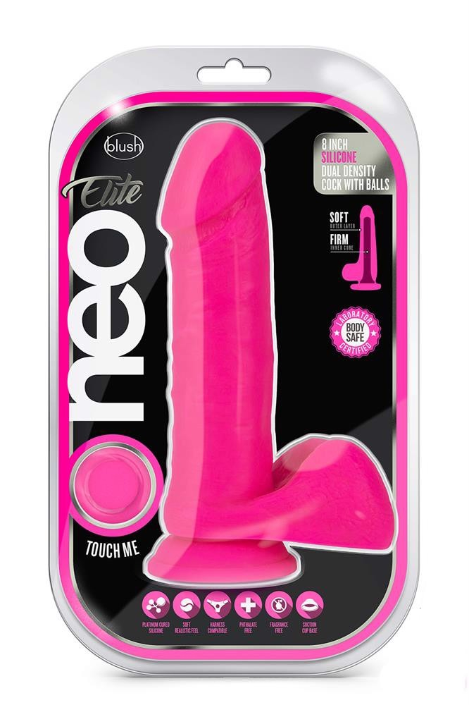 Фаллоимитатор двойной плотности с яичками Blush Neo Elite, неоново-розовый