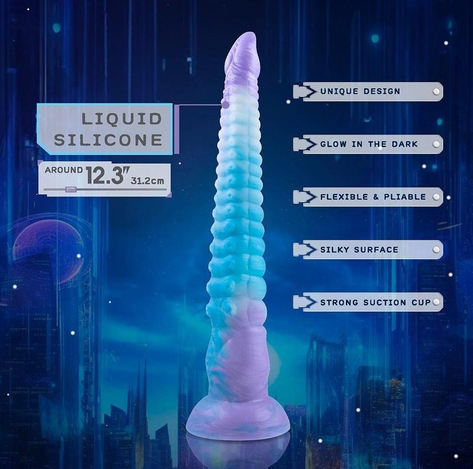 Фаллоимитатор NMC Monster Dildo — это эффектная игрушка для смелых ценителей необычного удовольствия. Его большая длина, яркое разноцветное оформление и эффект свечения в темноте делают эту модель настоящей звездой среди фаллоимитаторов.