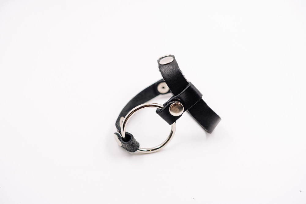 Характеристики Фиксатор для члена и мошонки с заклепками БДСМ из металла и натуральной кожи черного цвета Scappa