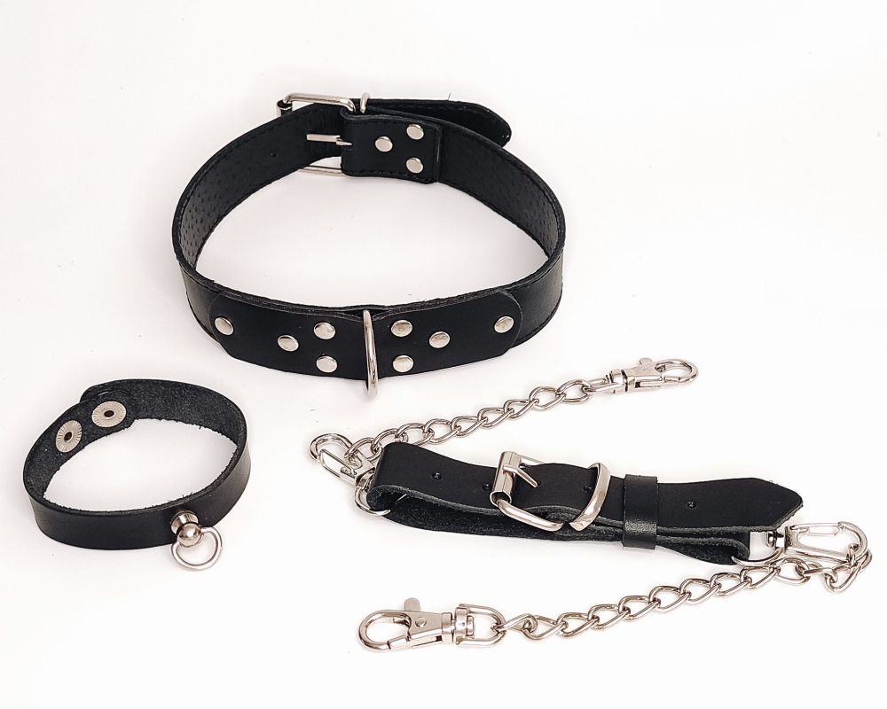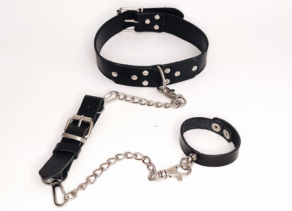 Фиксатор для члена на цепочке поводке с Ошейником БДСМ из натуральной кожи черного цвета Scappa