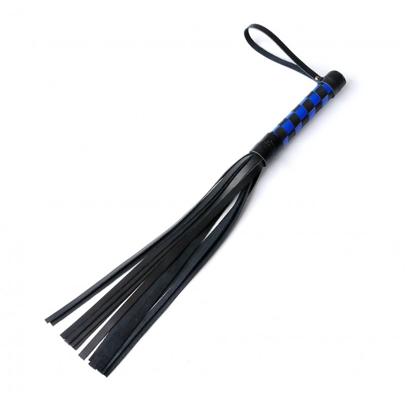 Флоггер с 14 хвостами БДСМ из натуральной кожи с расцветкой в шахматном порядке черно синего цвета Scappa