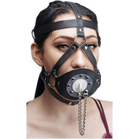 Черный намордник с пластиковым округлым кляпом для рта. Высококачественный материал. Металлическое кольцо для крепления цепи или поводка. Украшен металлическими заклепками.