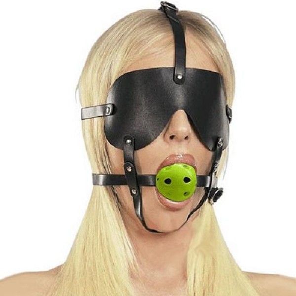 Кляп для рта из пластика с маской на глаза и фиксаторами.