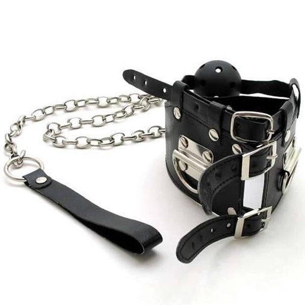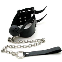 Современный черный кожаный намордник с резиновым мягким шариковым кляпом для рта. Высококачественный материал. Металический цепь-поводок.