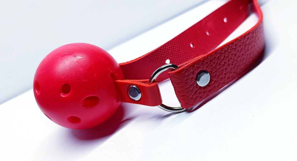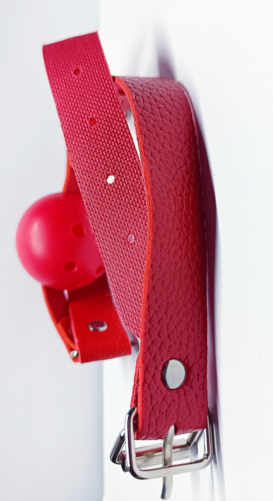 мягкий ремень с металлической застежкой, что подтягивается на нужную окружность головы и не причиняет дискомфорта. Пластиковый шарик с дырочками позволяет сабмиссиву дышать и выпускать слюну в шарик или сквозь него.