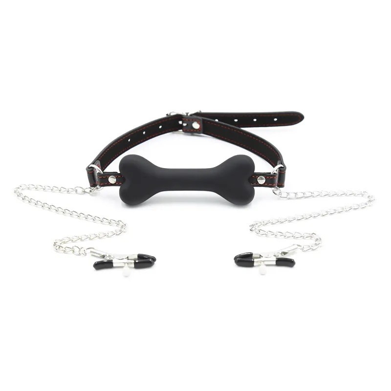 Кляп в рот косточка с зажимамы для сосков БДСМ черного цвета