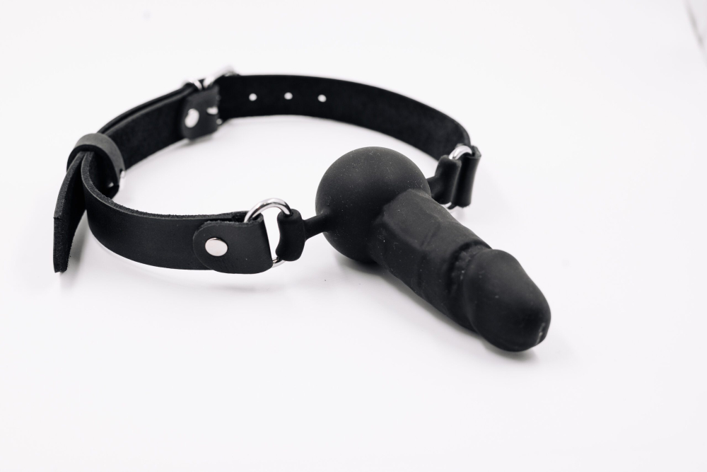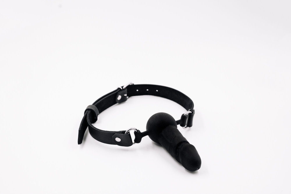 Характеристики Кляп в рот с реалистичным фаллоимитатором БДСМ из натуральной кожи черного цвета Scappa