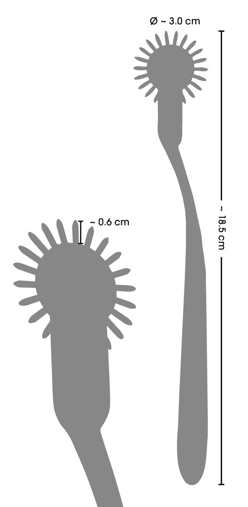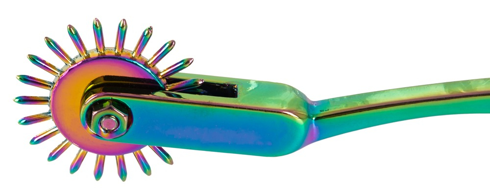 Pinwheel из фетиш-коллекции в переливающихся цветах радуги. Оно прокатывается по коже с большим или меньшим давлением, вызывая либо нежные стимулирующие ощущения, либо интенсивную приятную боль. Колесо усеяно маленькими, очень острыми иглами и может использоваться на любом участке тела. Длинная узкая ручка удобно ложится в руку, обеспечивая оптимальное направление и переменное, легкое давление.