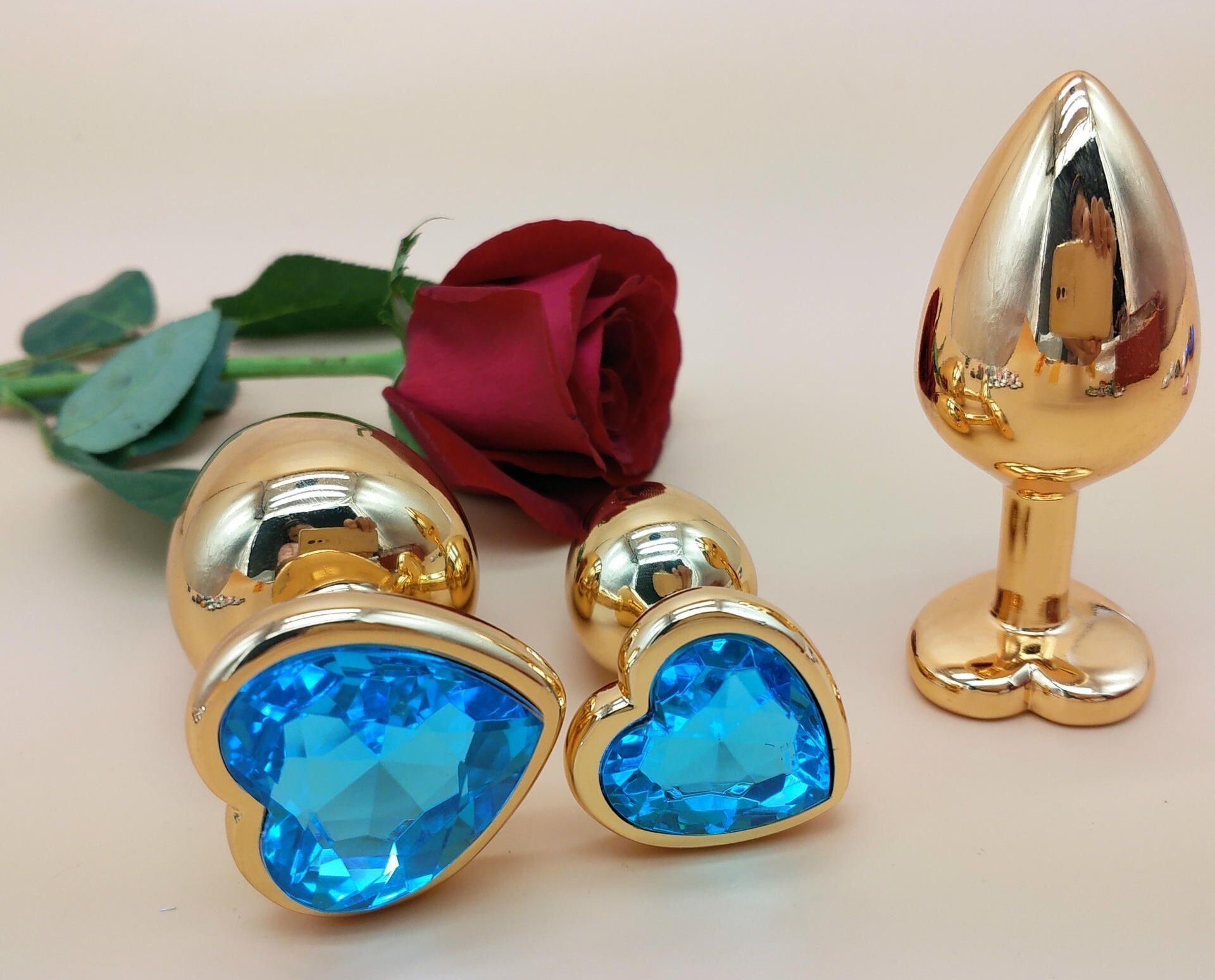 Характеристики Комплект золотистых анальных пробок в форме сердца с голубым кристаллом SKN-NMG10 размер S, M, L