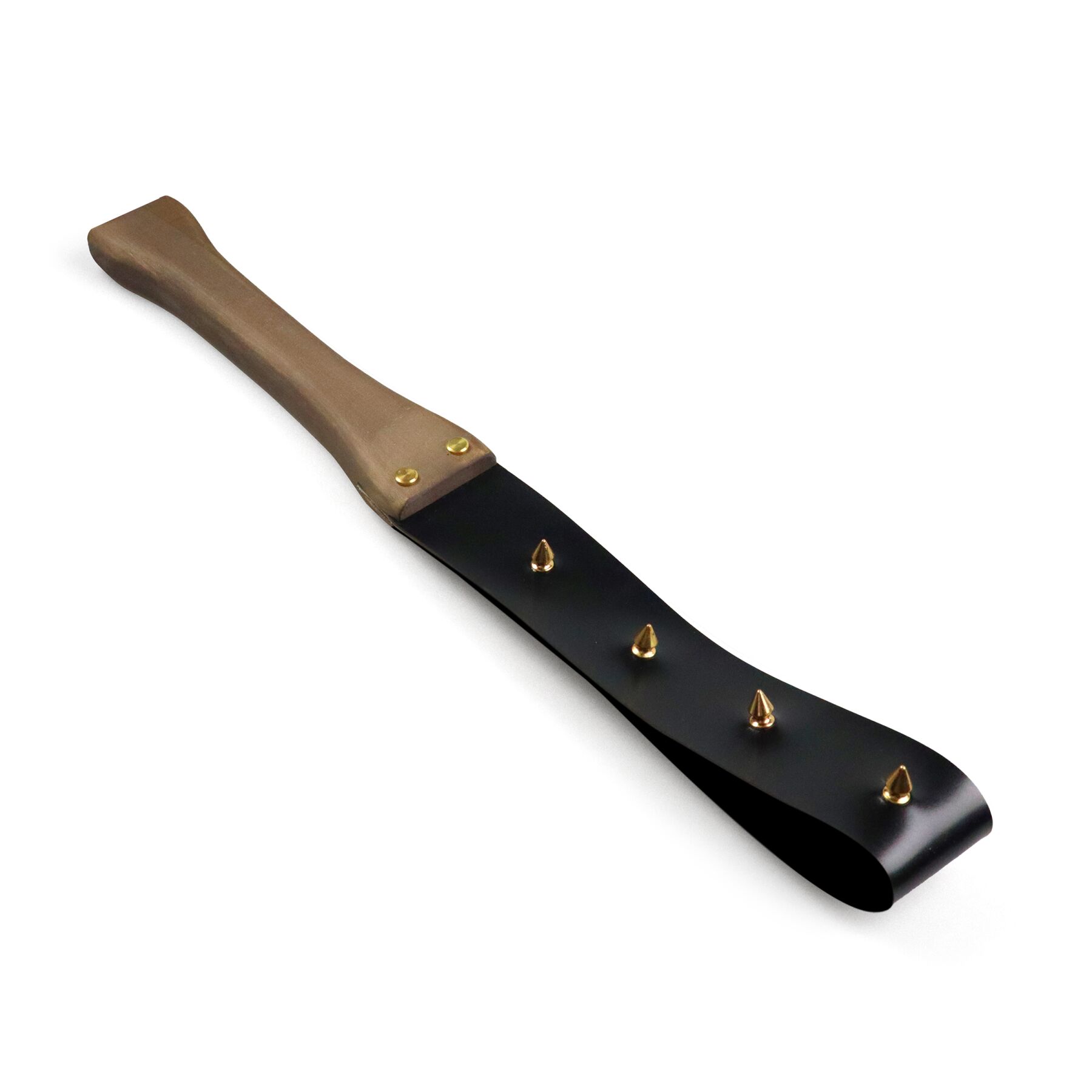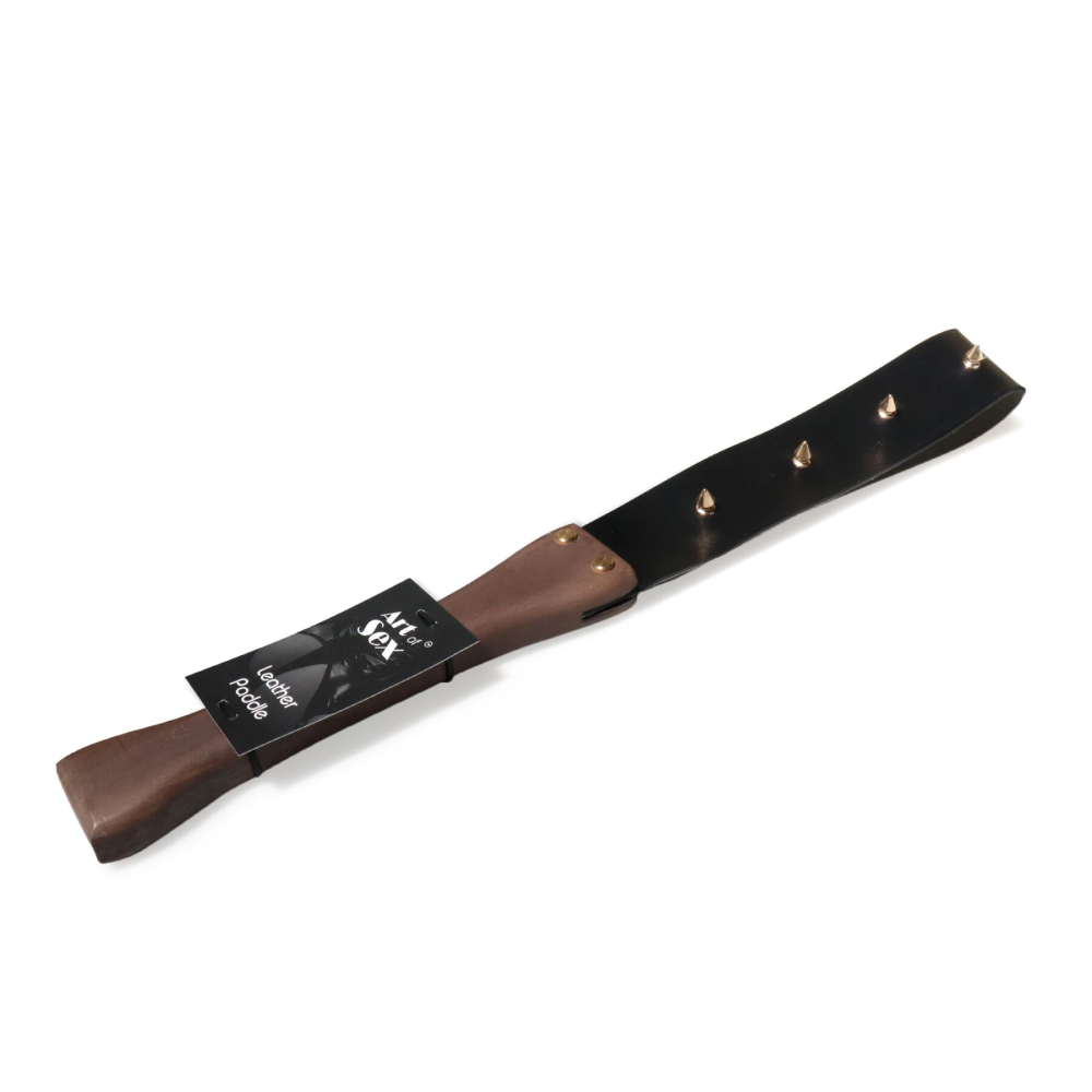 Кожаная шлепалка с шипами и деревянной ручкой черная Art of Sex BDSM Strong
