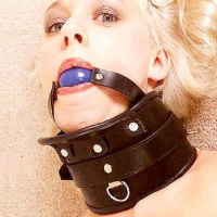 Современный кожаный намордник с мягким синим резиновым шариковым кляпом для рта. Широкий ворот с пряжками для укрепления мышц шеи. В наличии цвет серый