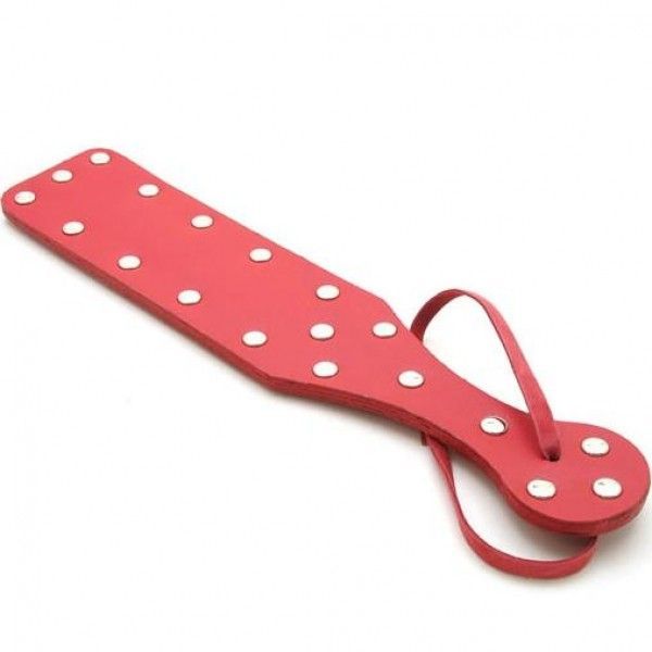 Красная шлепалка в форме весла. Изготовлена из натуральной кожи. Украшена металлическими заклепками по контуру изделия, что обеспечит жжение после удара у партнера. Прочный ремешок для руки. Размеры: длина 30 см., ширина 6 см., толщина 0,6 см.