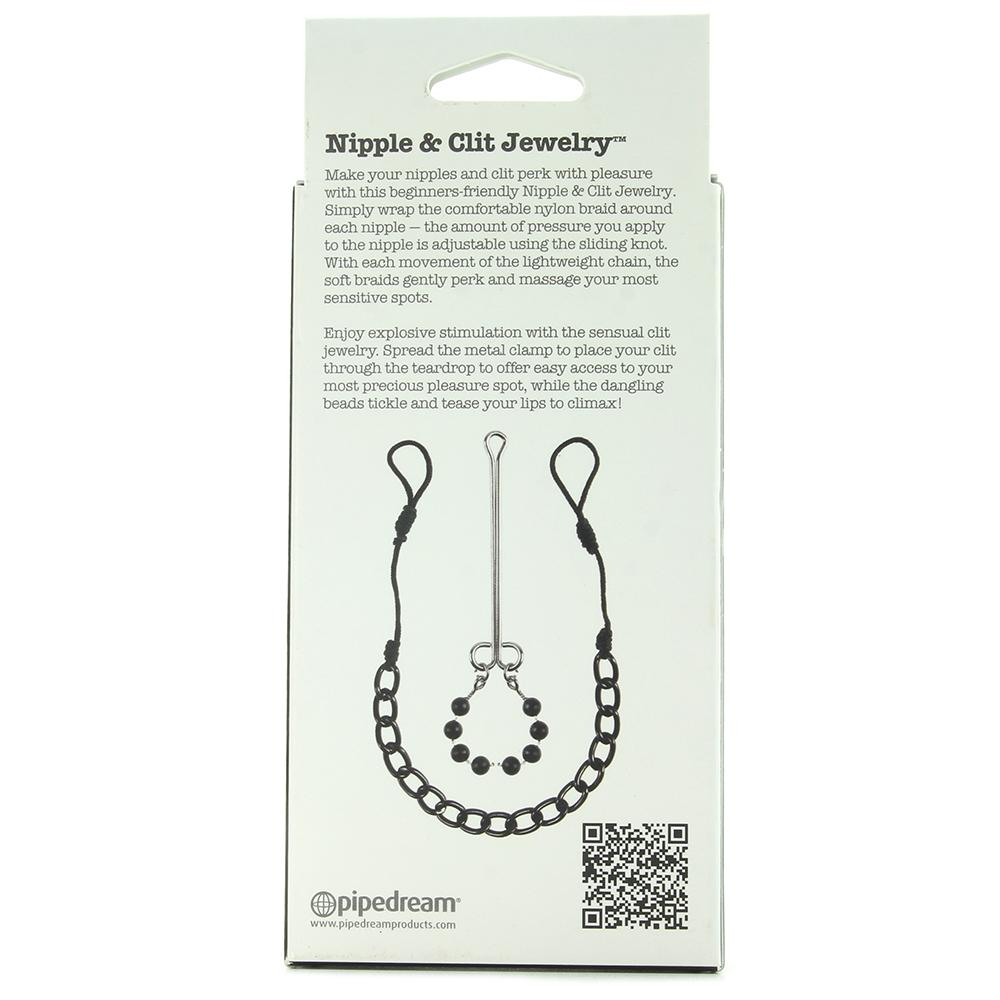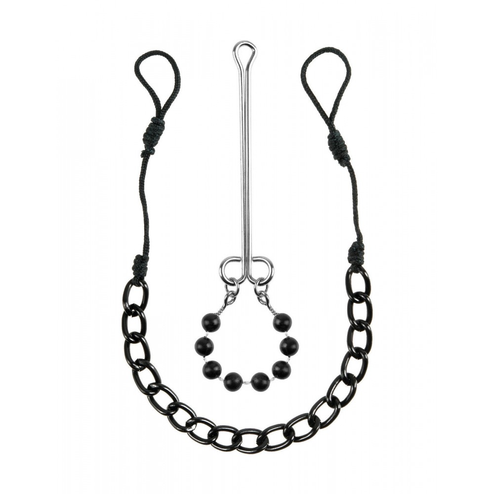 Ласо для сосков с цепью и зажим для половых губ, черный с серебряным.