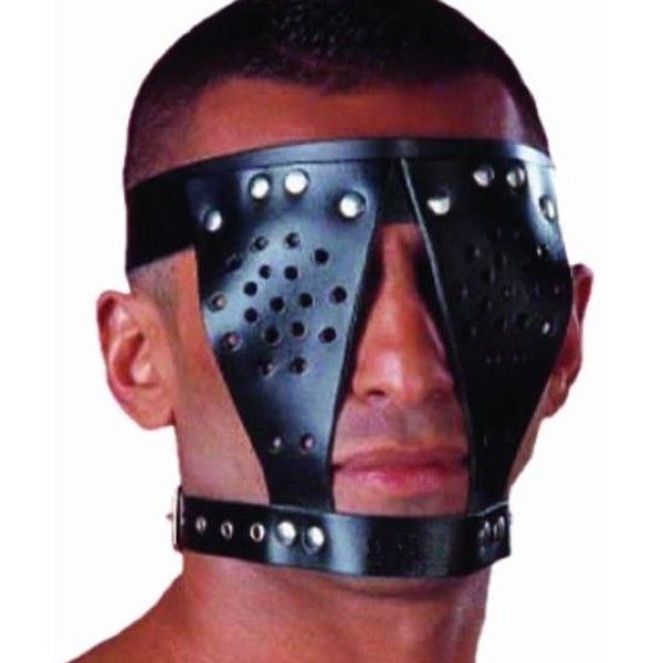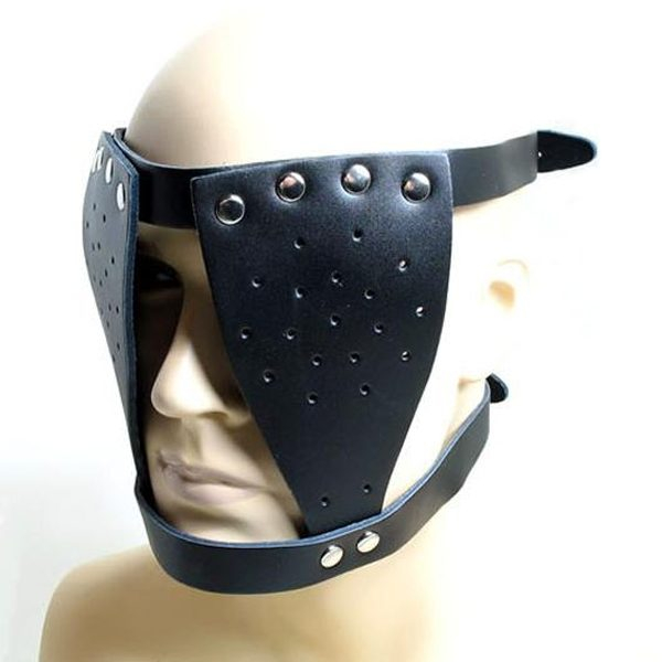 Черная маска из высококачественного материала. Современный дизайн, дырочки в области глаз, металические кнопки, два крепящихся ремня.
