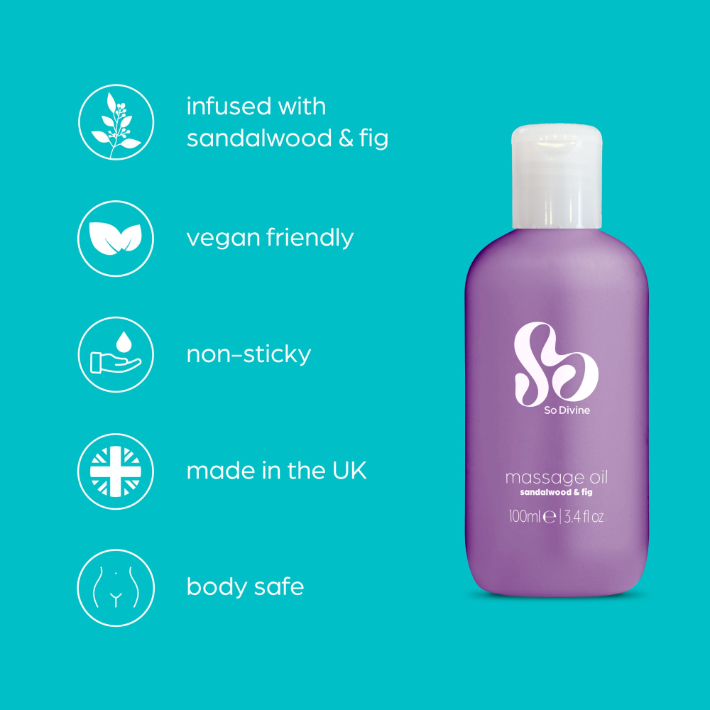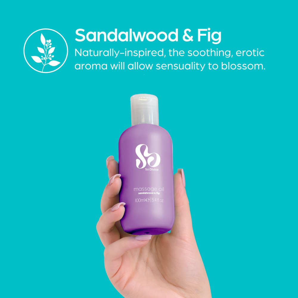 Создайте свои собственные особенные моменты близости с маслом Sandalwood & Fig So Divine, которое прекрасно дополнит прелюдию и выведет эротический массаж на новый уровень.