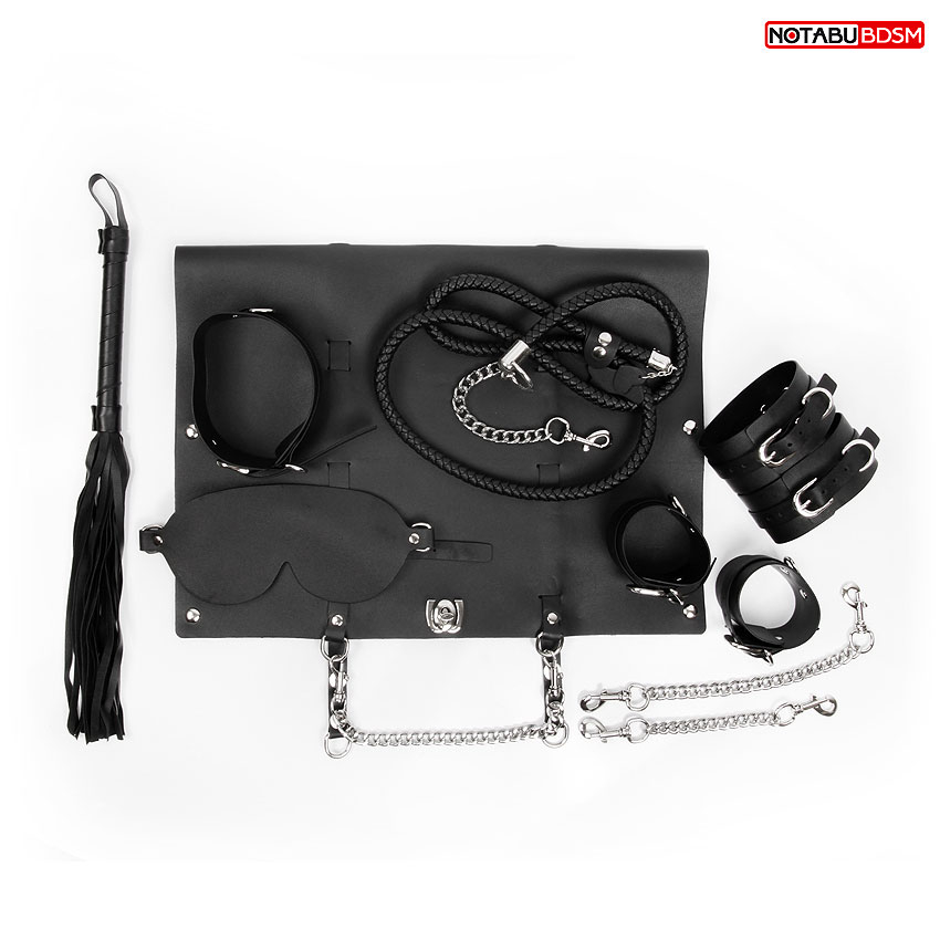 Великолепный набор аксессуаров для любителей БДСМ-игр. В комплект входят маска, фиксатор, ошейник с плетённым поводком, наручники, оковы, плеть.